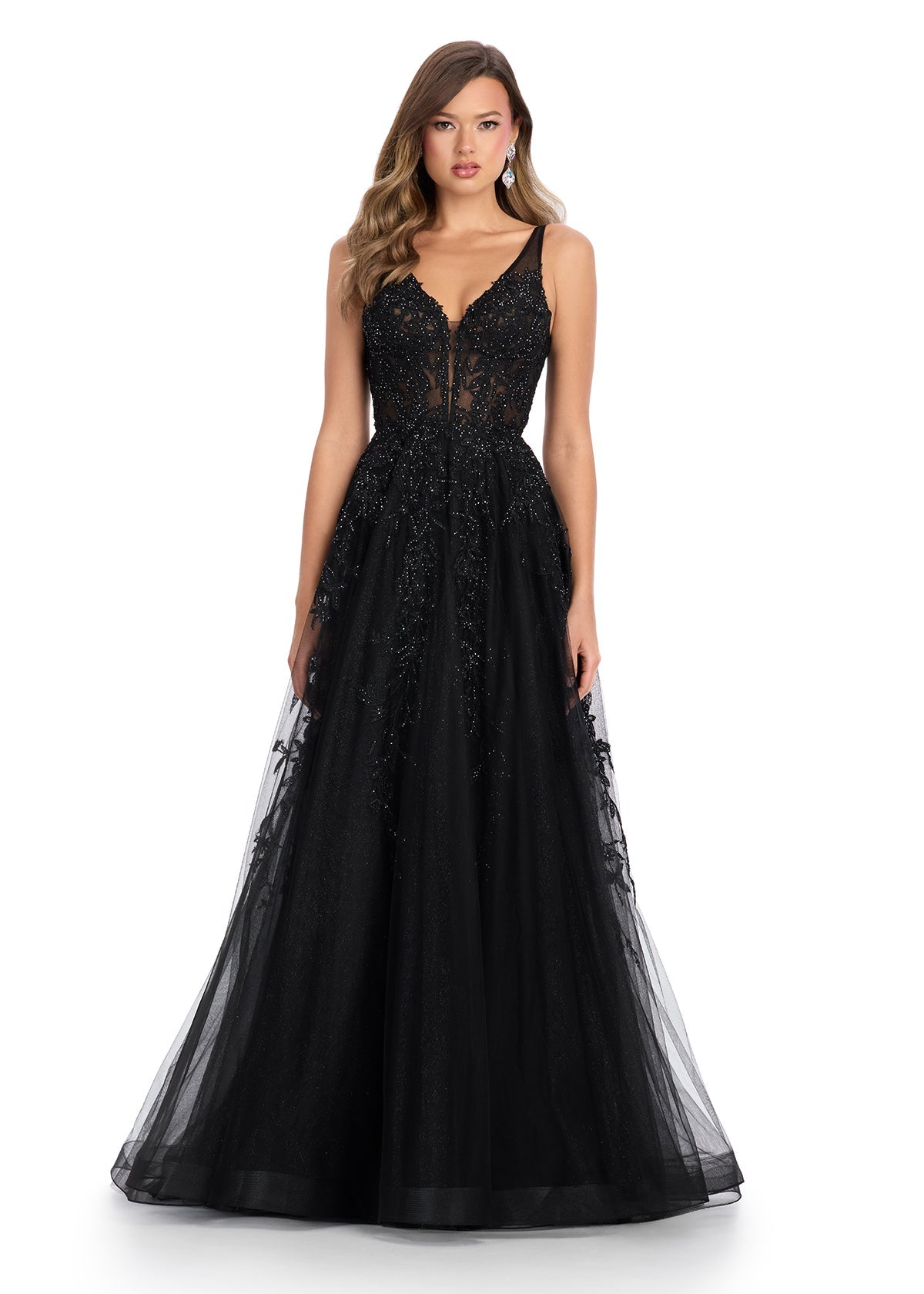 ¡Luce una gran entrada con este vestido de gala de tul! Este vestido está adornado con apliques bordados en todo el bustier que se deslizan por la falda. • Escote en V • Espalda abierta • Falda evasé • Cola larga