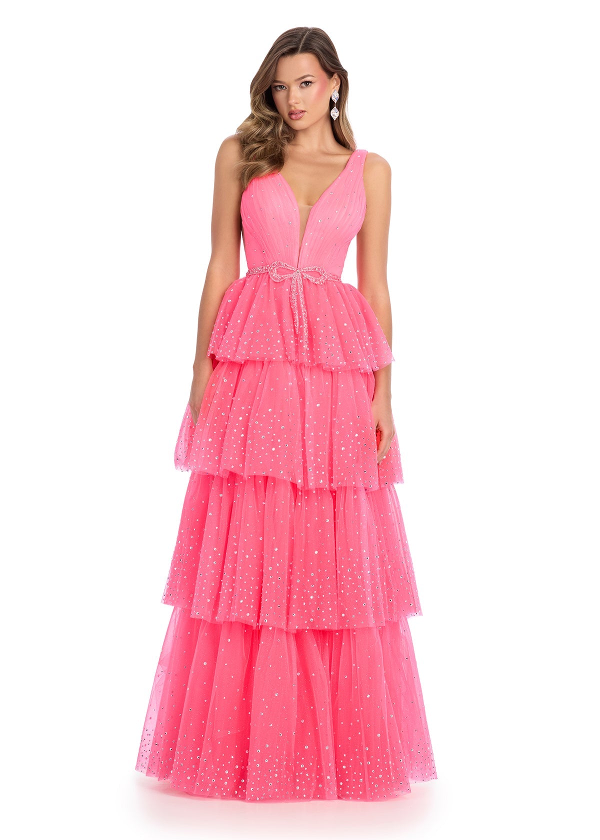 Shine bright in this fully stoned dress. The tiered skirt and bow belt details are adorned with press on stones that will sparkle all night. • V-Neckline • Press On Stones • Tiered A-Line Skirt • Crystal Bow Belt