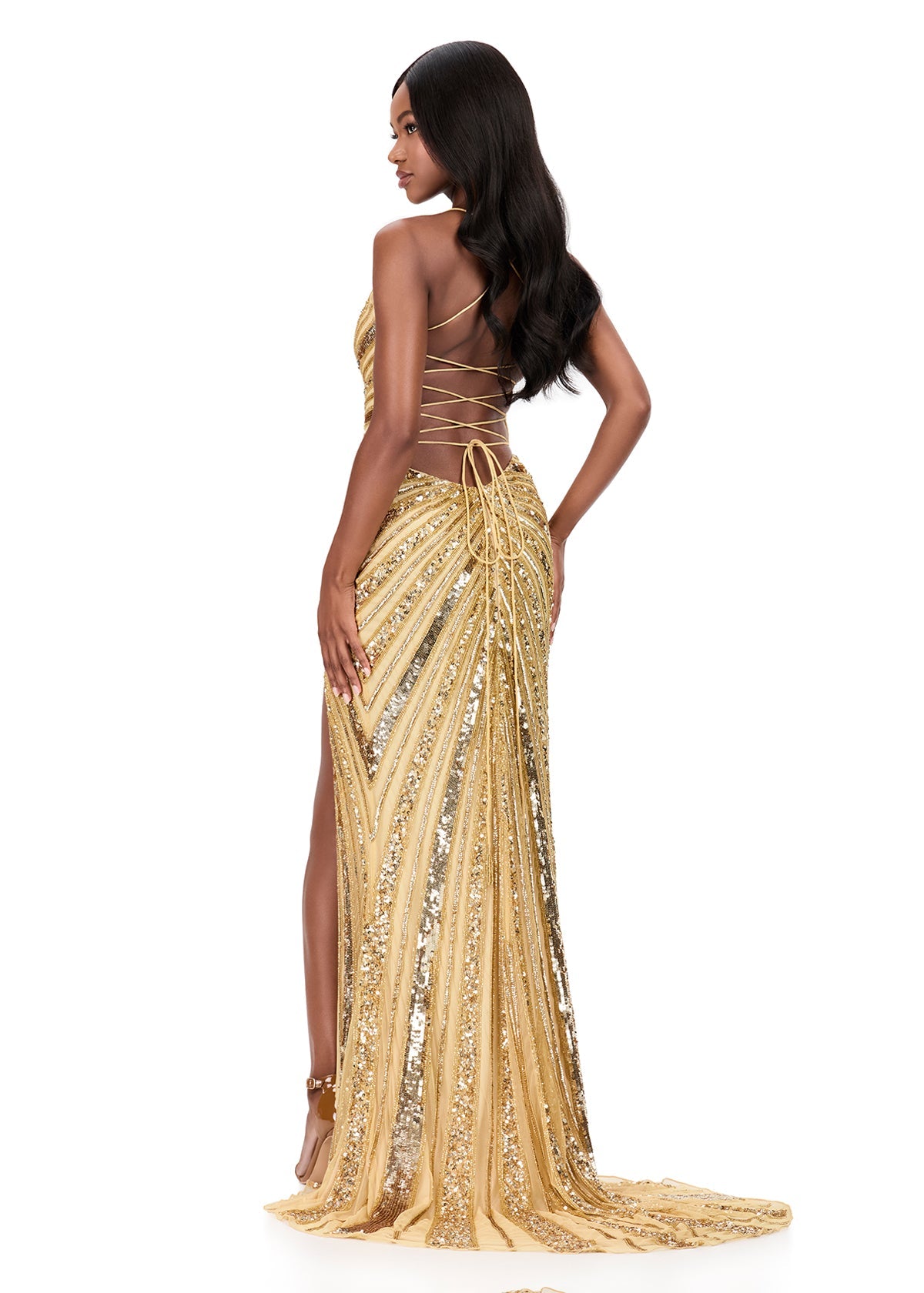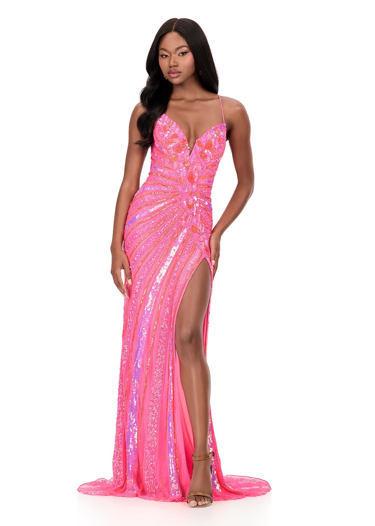 Turn heads in this stunning fully beaded gown by ASHLEYlauren. ASHLEYlauren Style 12149 features a fitted silhouette adorned with intricate beadwork that shimmers from every angle. The plunging neckline, high slit, and lace-up back combine to create a sultry yet elegant look perfect for prom, pageants, or red-carpet events. The sweeping train adds extra drama, ensuring all eyes are on you.