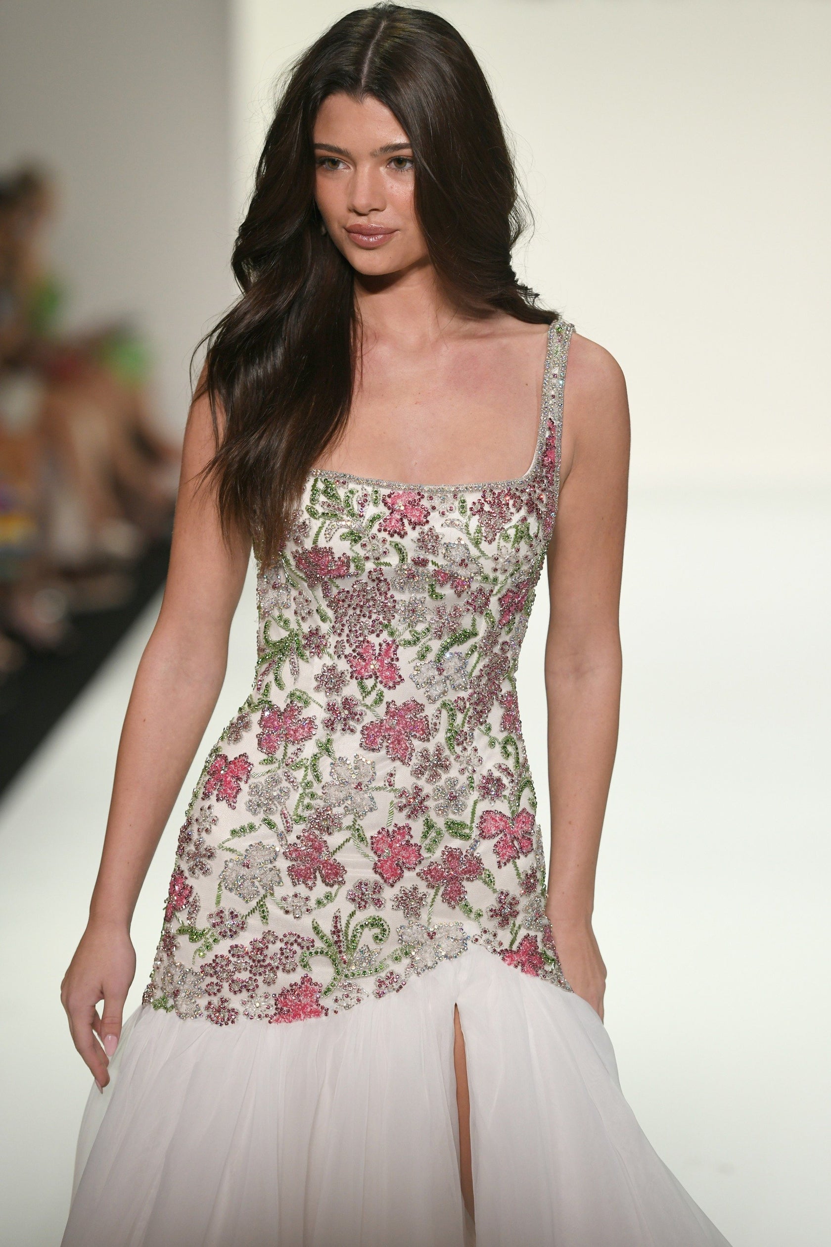 Mermaid gown with fully beaded bodice and chiffon skirt with slit.