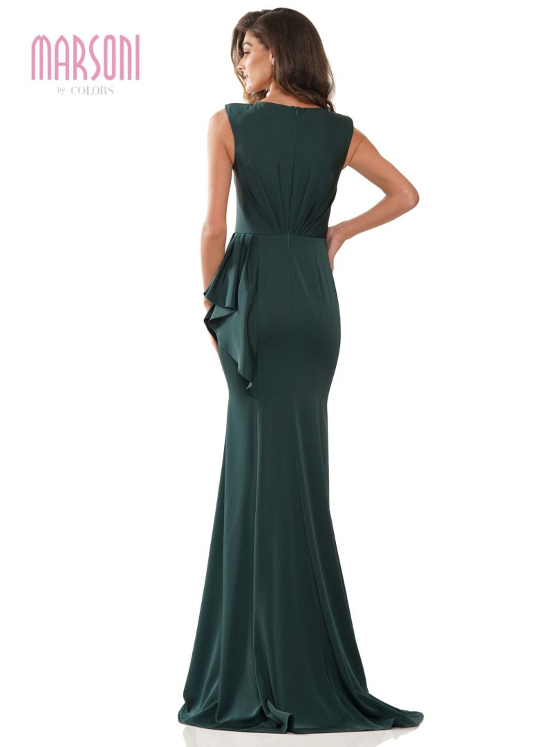 elegant long formal dress featuring a V-neckline, ruched bodice, side slit, and a flowing sweep train, ideal for weddings, evening events, or as a mother-of-the-bride gown.