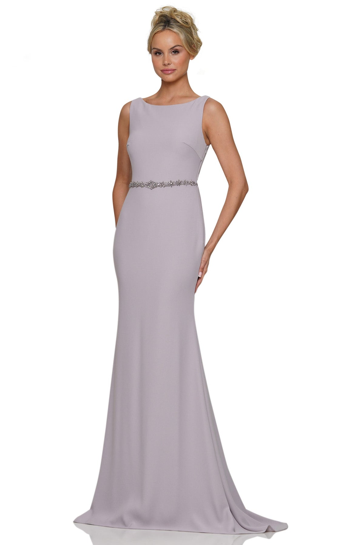 sleeveless formal gown in stretch crepe, featuring a bateau (boat) neckline, intricately beaded waist, and a figure-hugging trumpet/marmermaid silhouette with a sweeping train and floral illusion back.