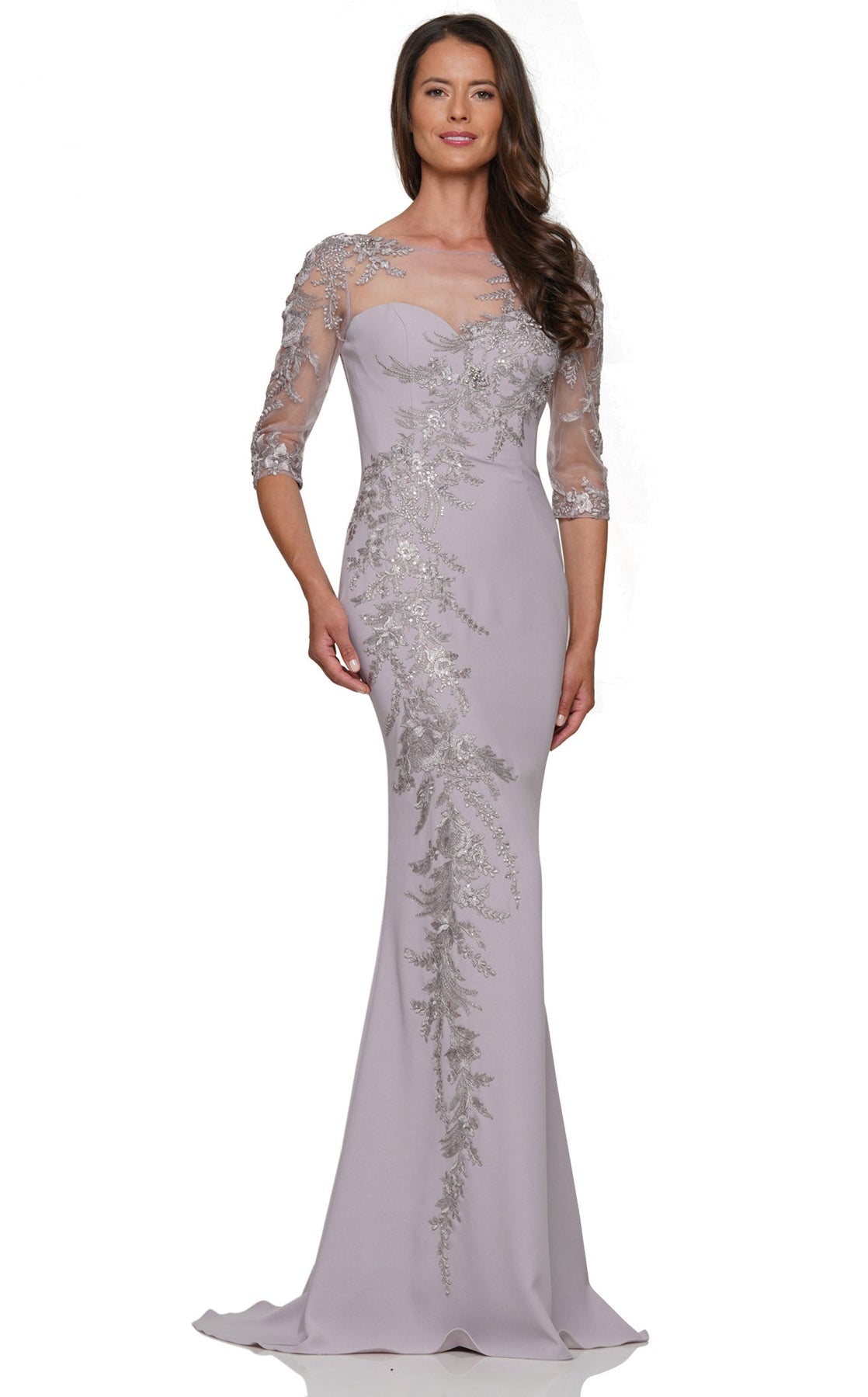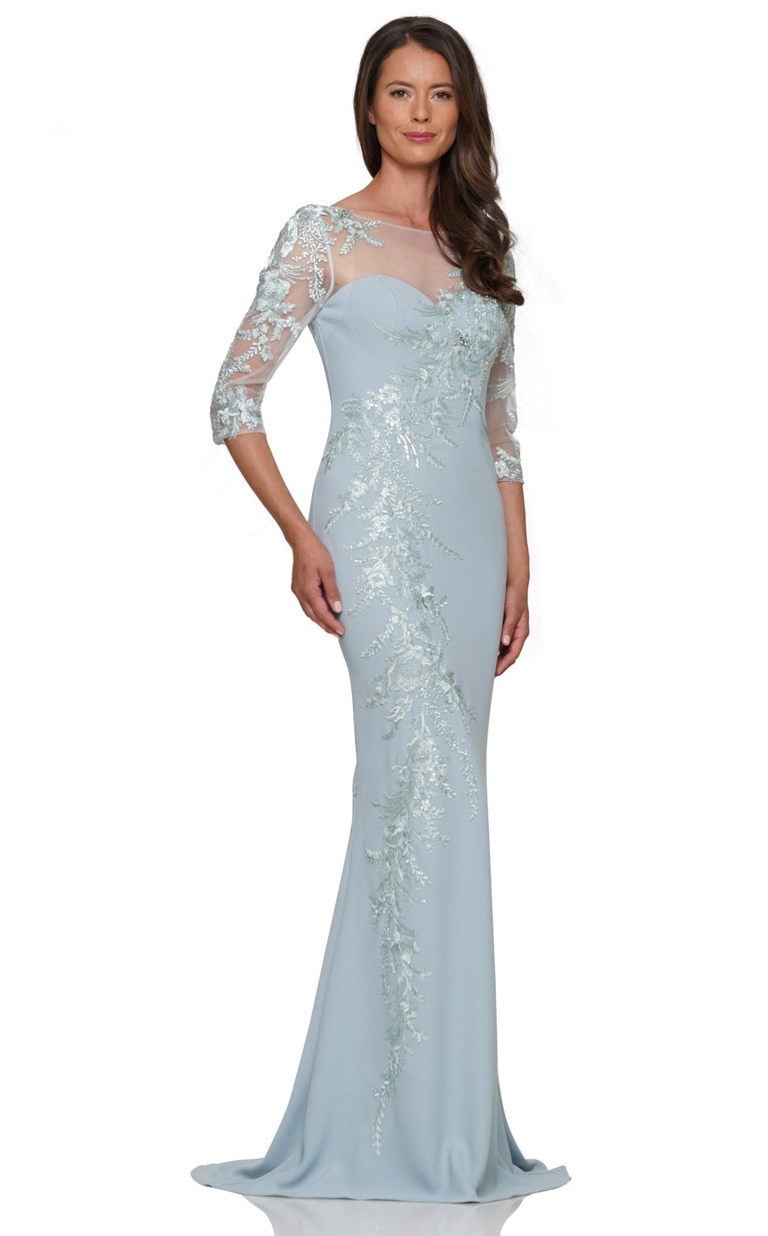 feminine gown featuring a mermaid or column silhouette, illusion neckline, three-quarter or quarter-length sleeves, delicate lace appliqué, and optional train