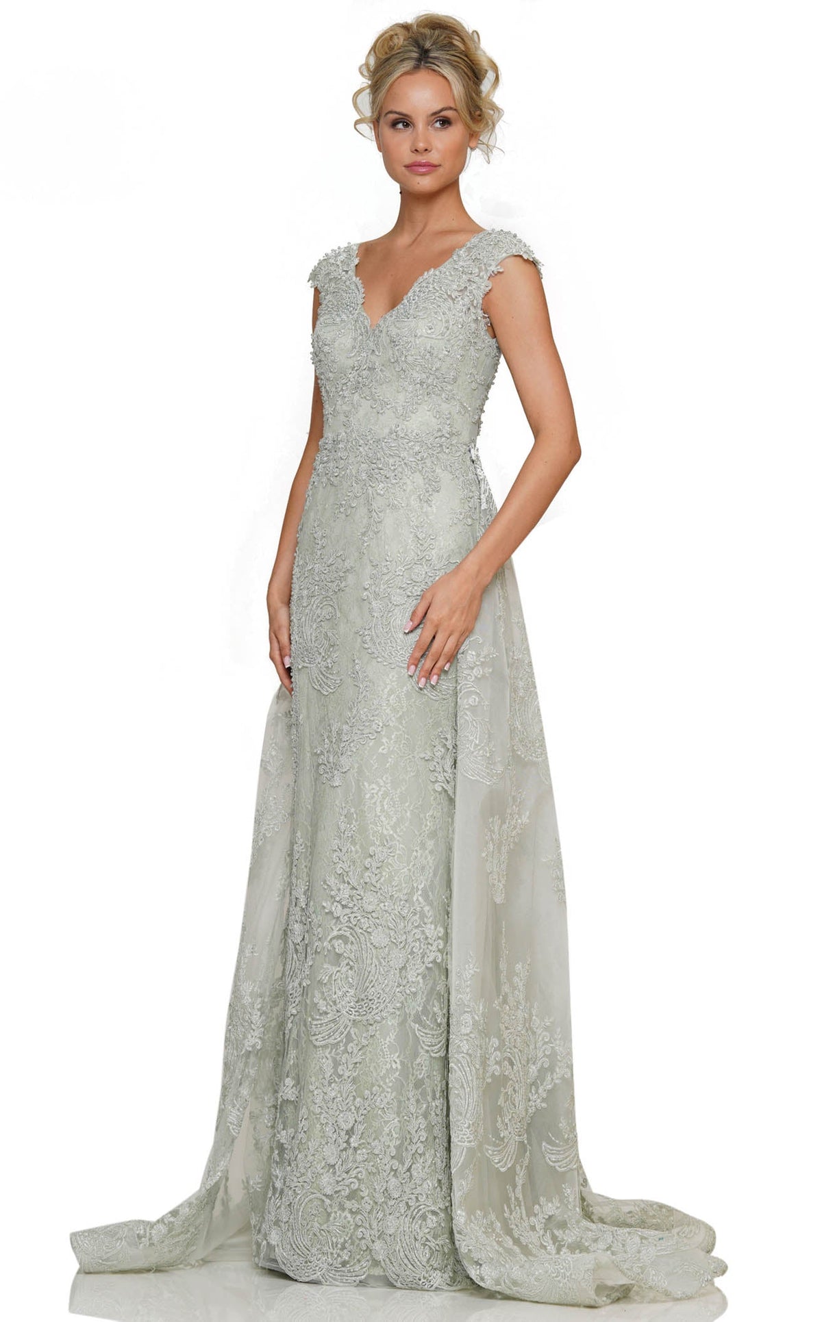 sophisticated evening gown featuring intricate embellishments, a V-neckline, cap sleeves, and a long train that creates a striking combination of elegance and modern charm.