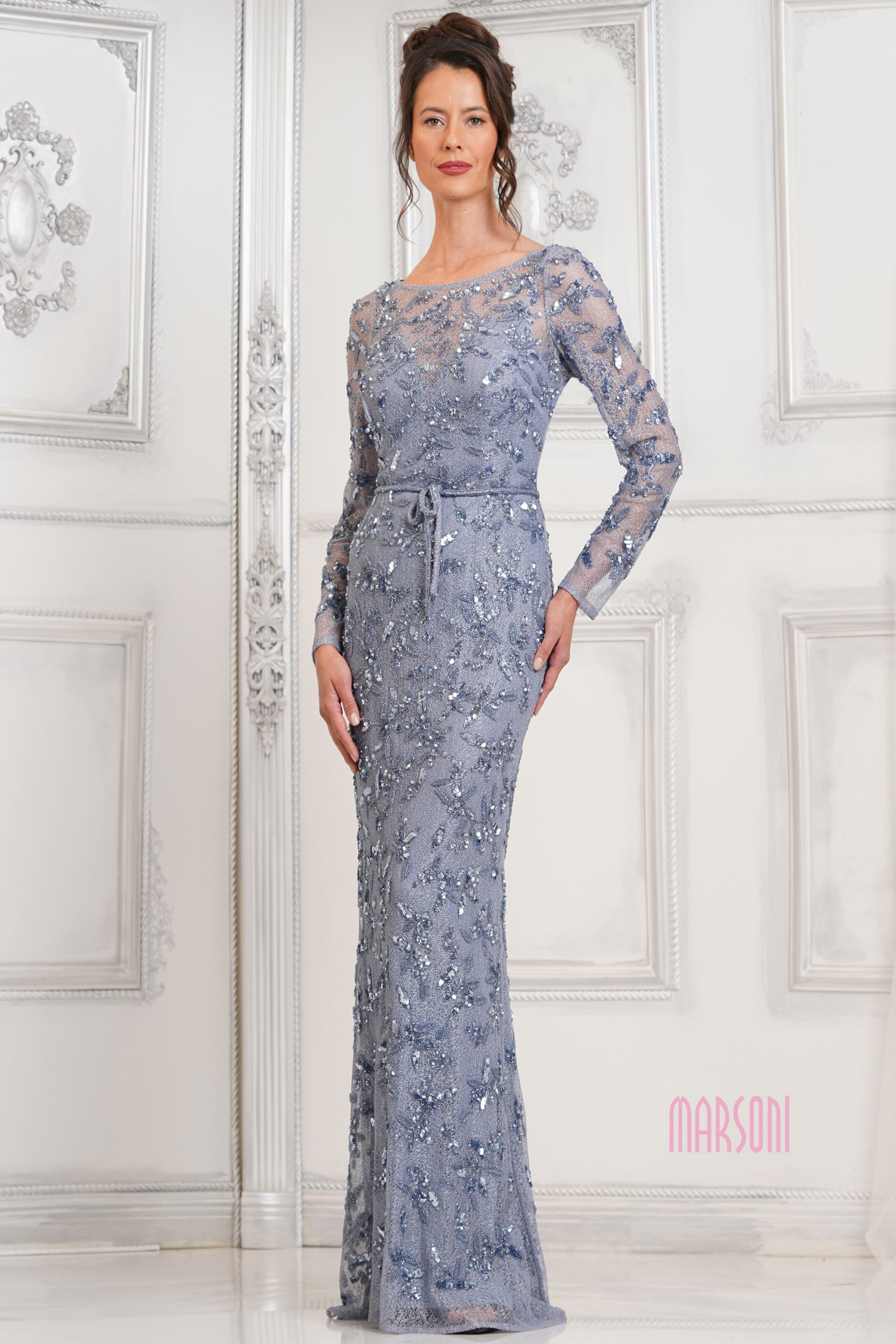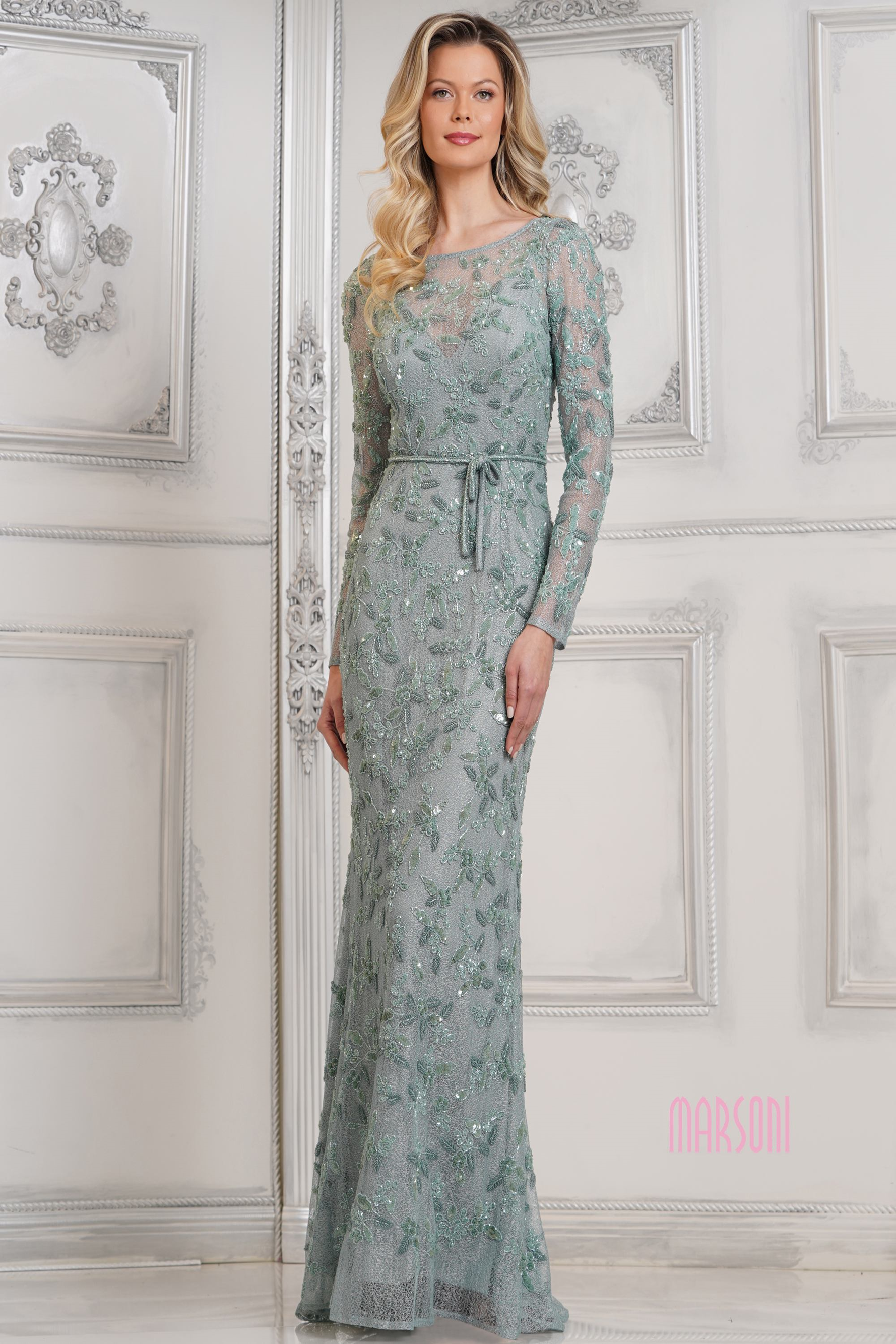long sleeve formal gown, designed primarily for mothers of the bride or groom, featuring intricate beading, a low scoop back