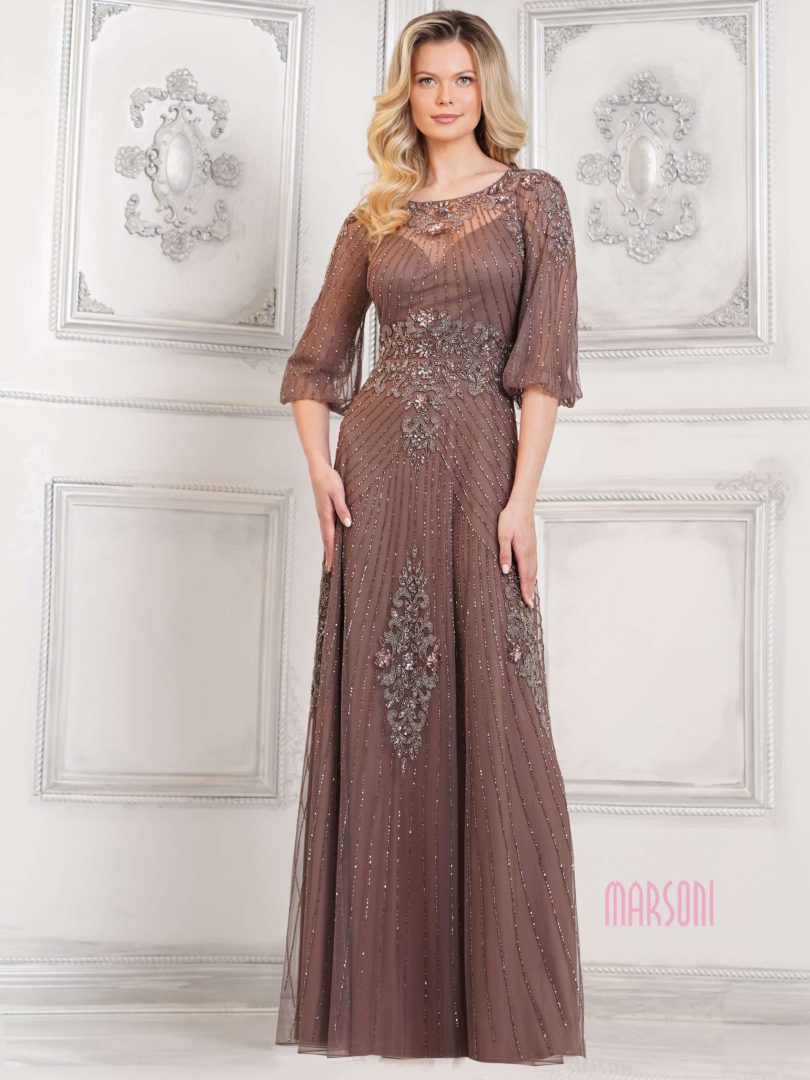 fully beaded A-line evening or mother-of-the-bride gown with illusion neckline, 3/4 length sheer sleeves, and intricate embroidery for sophisticated formal occasions.