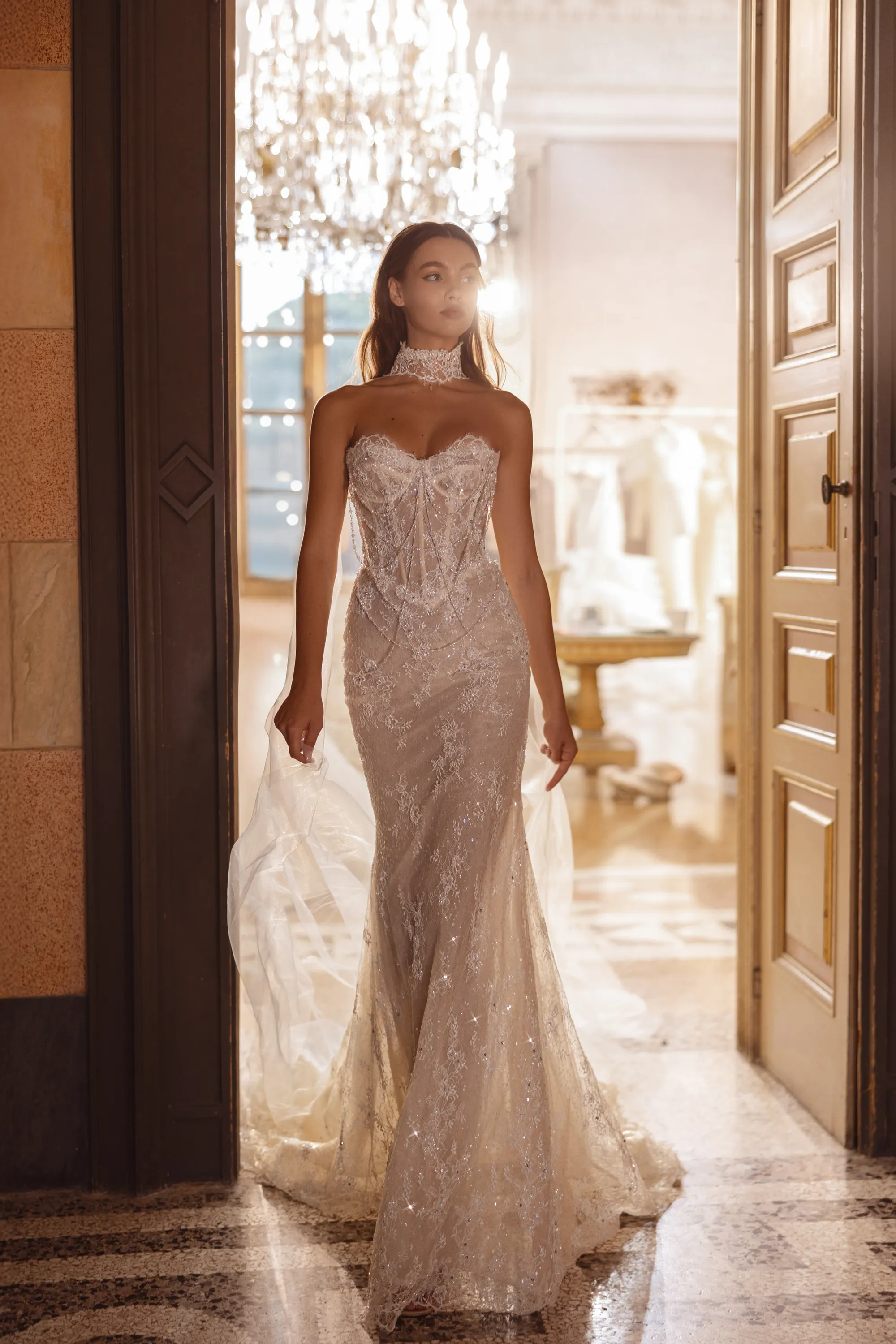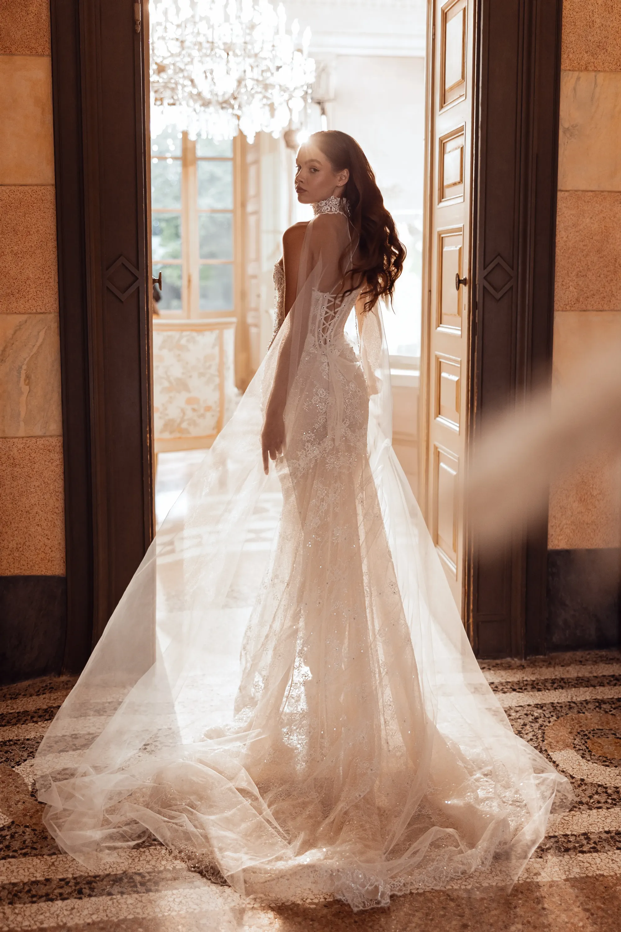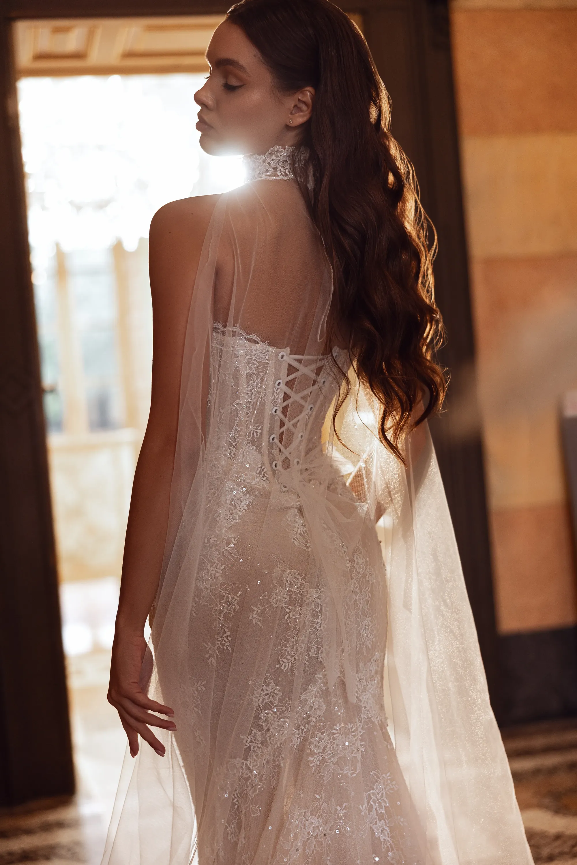 This stunning mermaid gown in soft, milk nude shade ?rafted from delicate Chantilly lace, the dress features a semi-transparent design that beautifully highlights the intricate lacework. The bodice is adorned with exquisite pearl and crystal thread embellishments, adding a touch of luxury and sophistication. Completing the look is a sheer mesh cape, complemented by a matching lace choker, creating a graceful and enchanting silhouette. This dress is a true masterpiece for the modern bride seeking both romance and refinement.