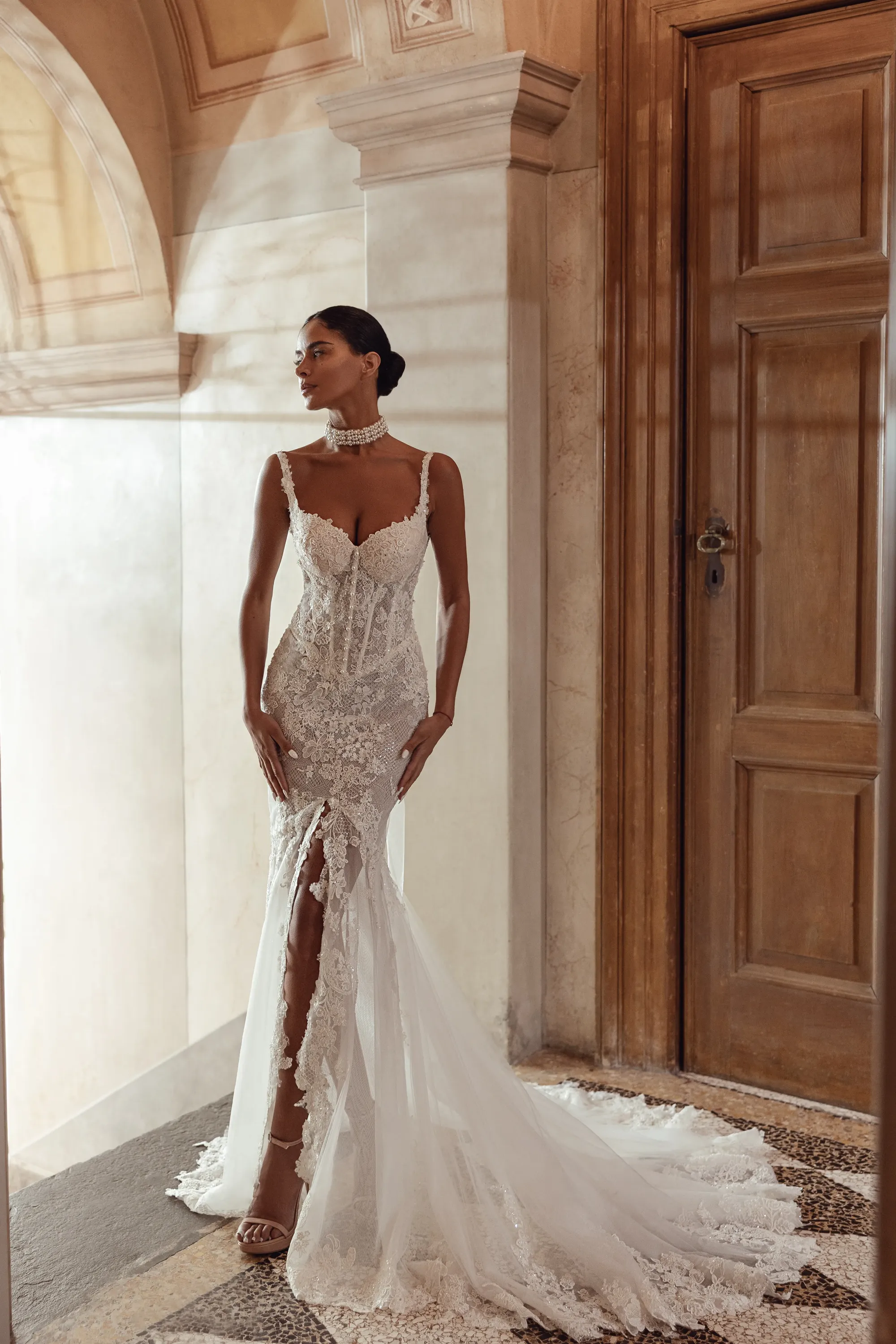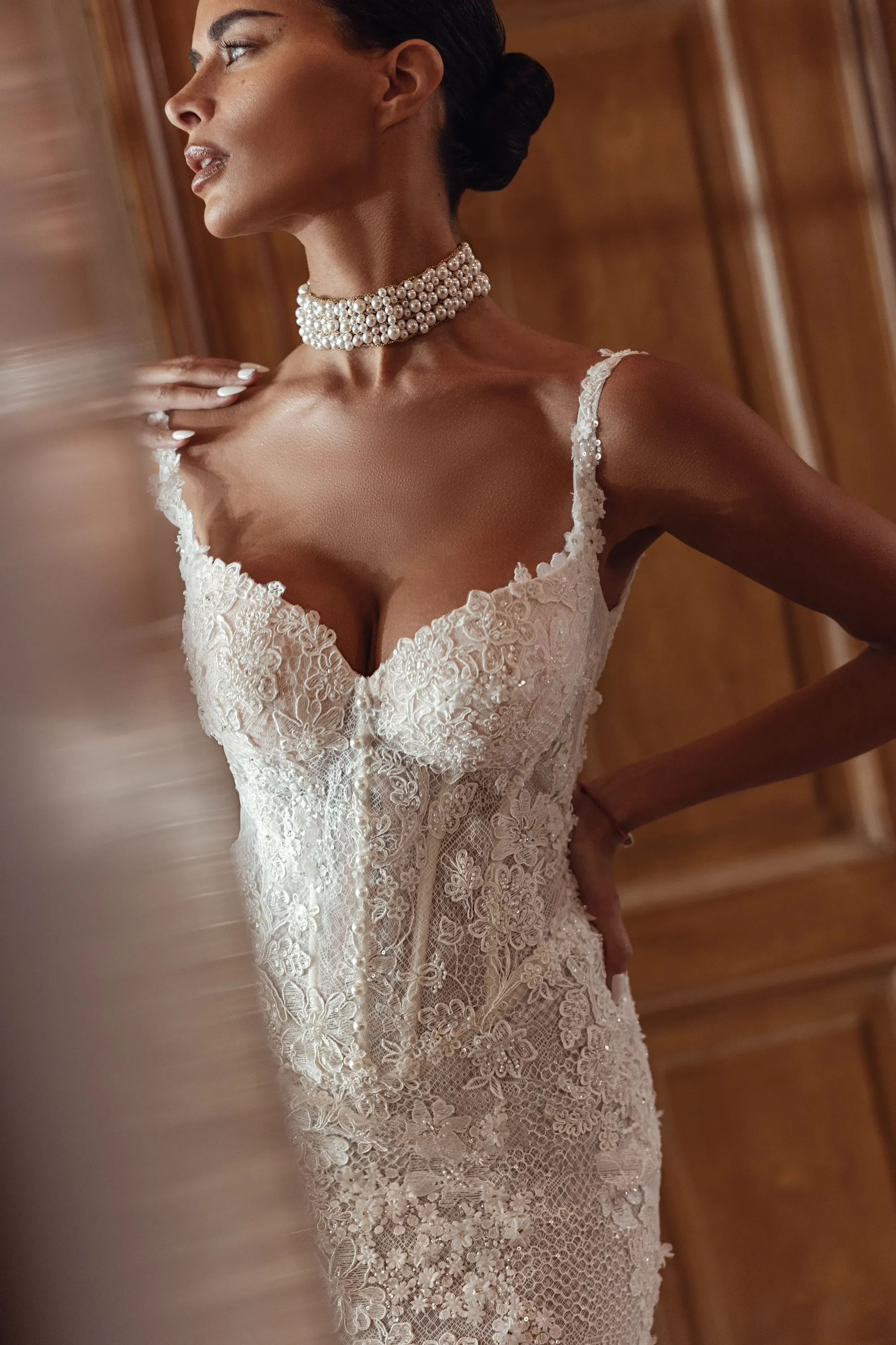 This exquisite mermaid gown in a soft milk shade is made from delicate corded lace and mesh. Featuring a daring center slit and thin straps, the dress offers a perfect blend of elegance and sensuality. The corset is beautifully adorned with pearl beads and intricate 3D flowers, adding a touch of opulence and femininity.