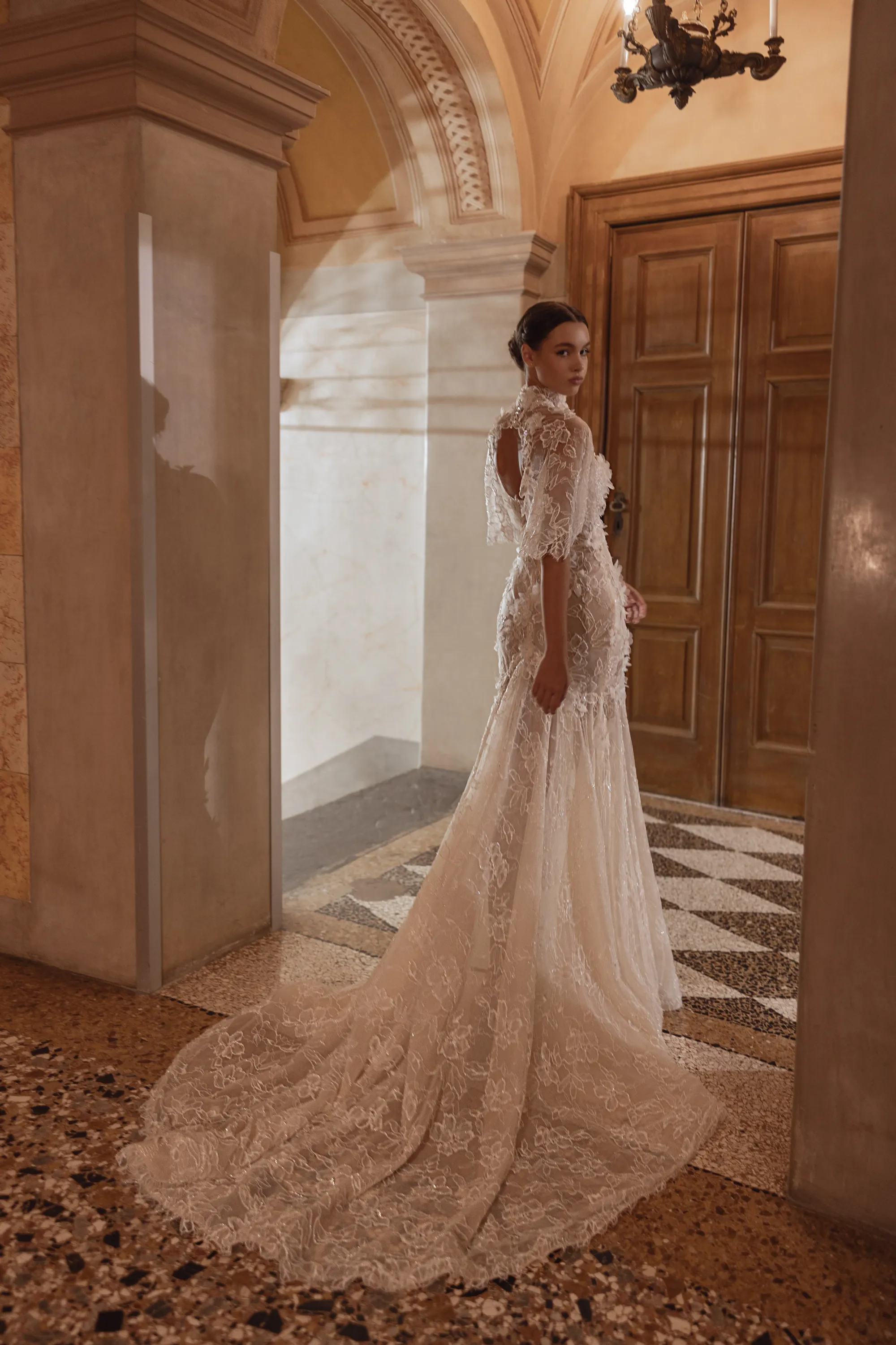 This enchanting mermaid gown in delicate ivory nude lace offers a soft and romantic feel. Adorned with intricate 3D flowers, the dress exudes elegance and sophistication. It is beautifully complemented by a removable cape that covers the shoulders, adding a graceful touch and versatility to the look. Perfect for the bride who desires a blend of classic beauty and modern charm.