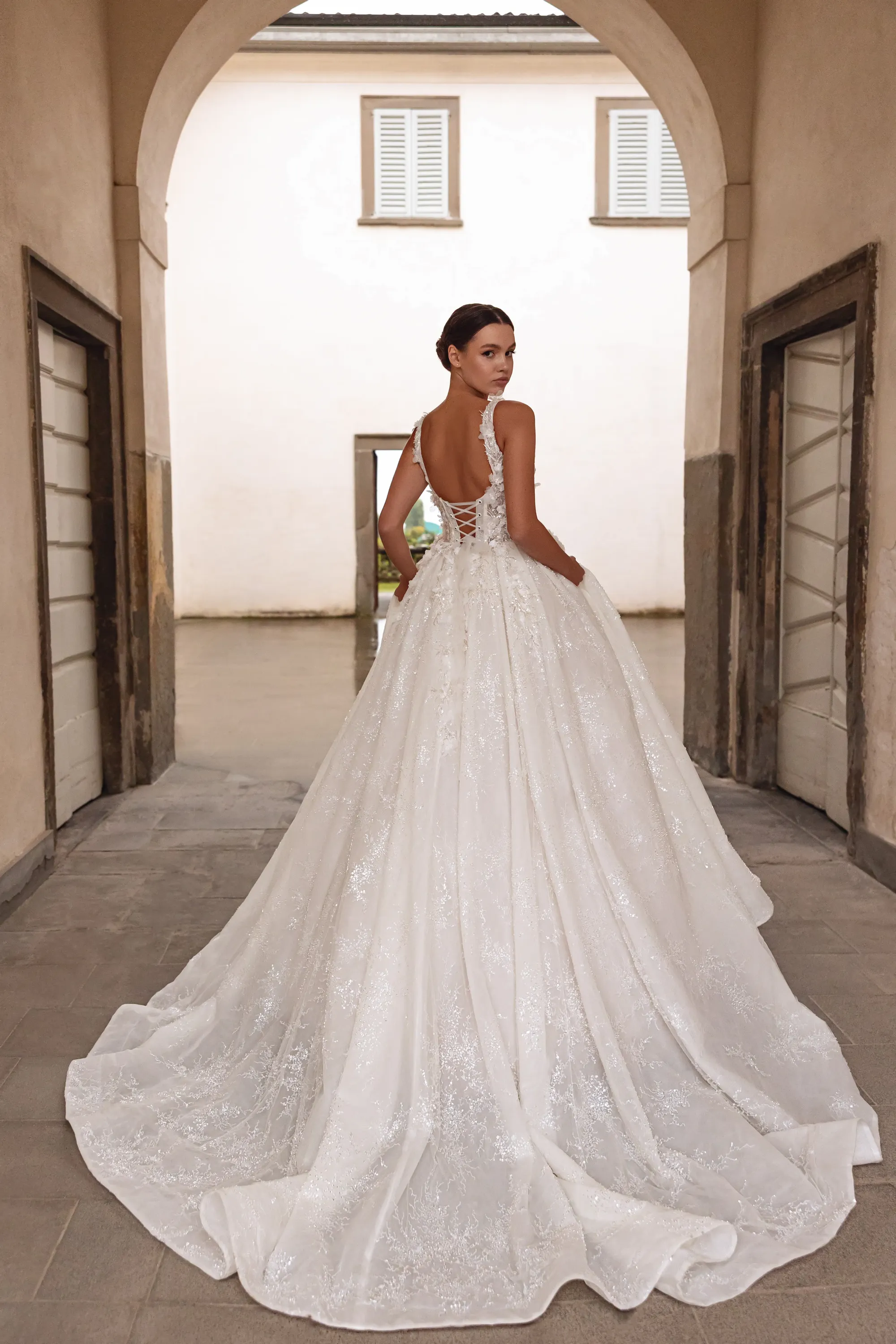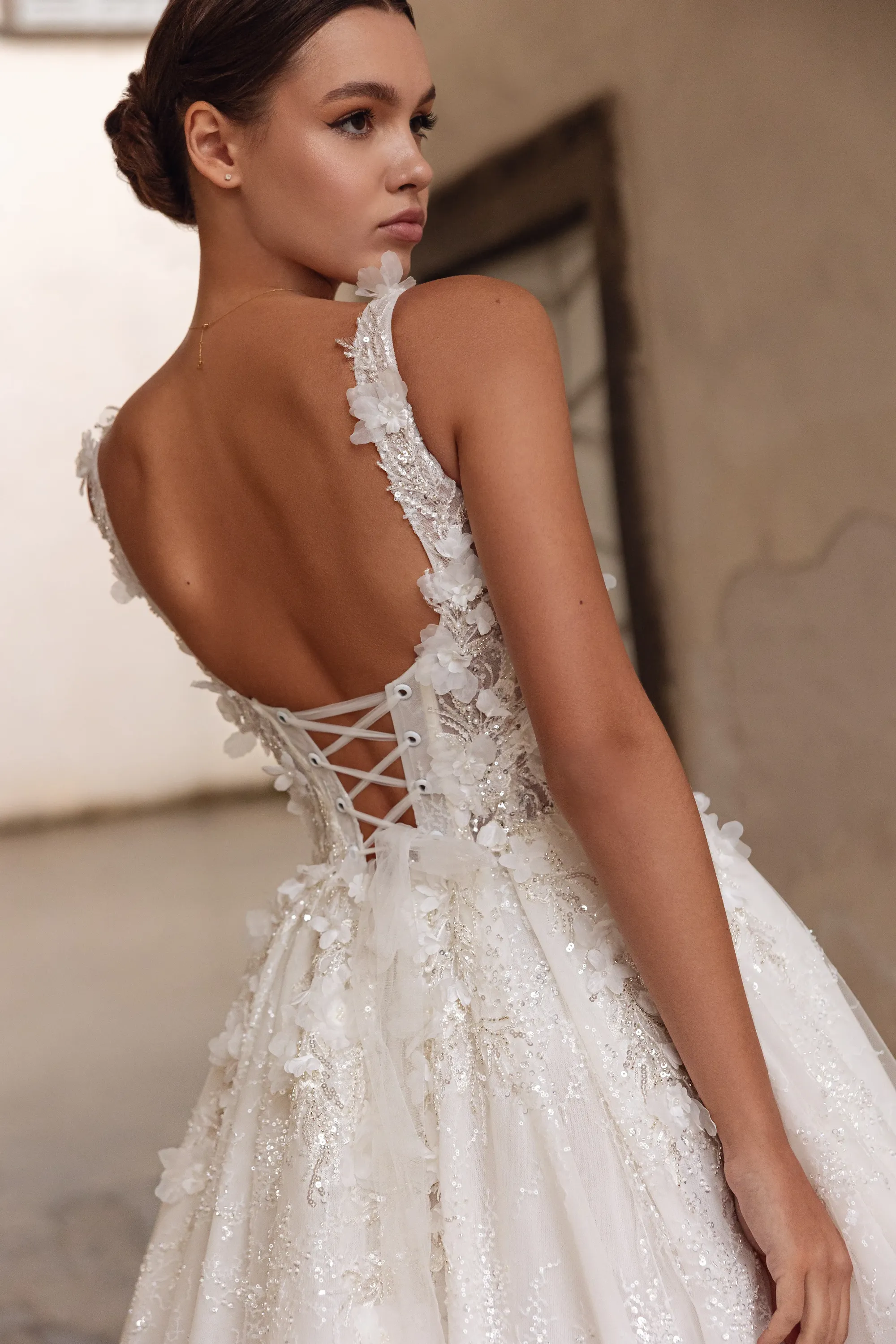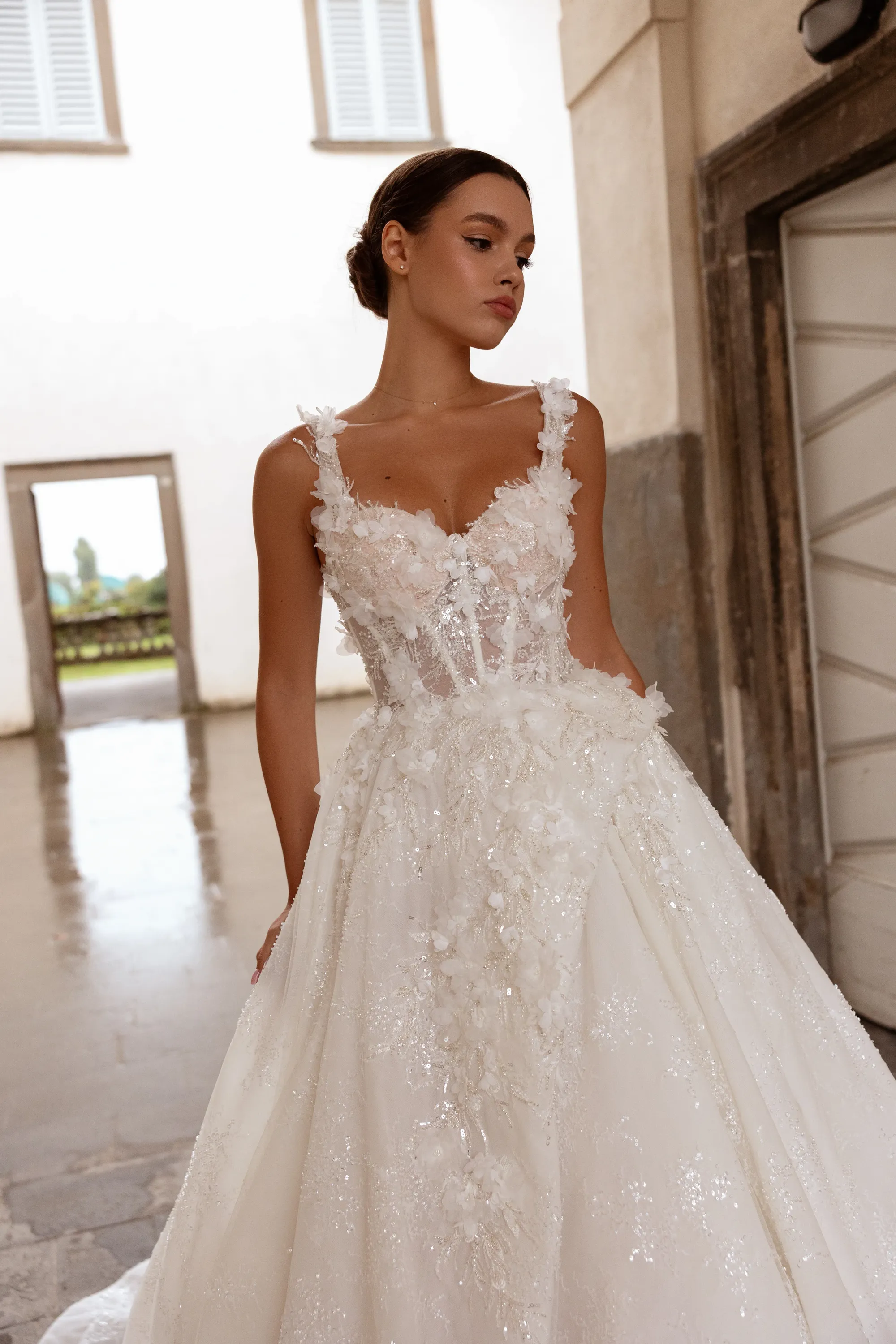 This enchanting princess silhouette gown is crafted from soft tulle with shimmering sequins, creating a magical and ethereal look. The bodice is beautifully adorned with intricate 3D flowers and delicate beads, adding a touch of elegance and texture. The skirt features an asymmetric pleat design, enhancing the gown's graceful flow.