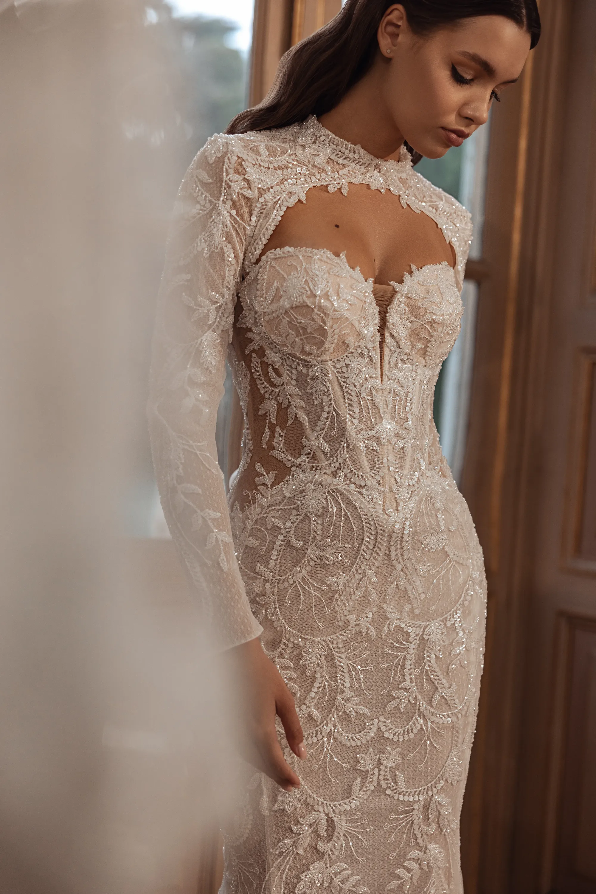 This exquisite mermaid gown in soft milk-colored lace features an intricate embroidered pattern of lace and crystals on a nude mesh base. The dress is adorned with transparent side cutouts, beautifully embellished with the same lace, adding a touch of sensuality and elegance. It also includes a detachable bolero with long sleeves, adding a graceful and romantic element to the overall look.