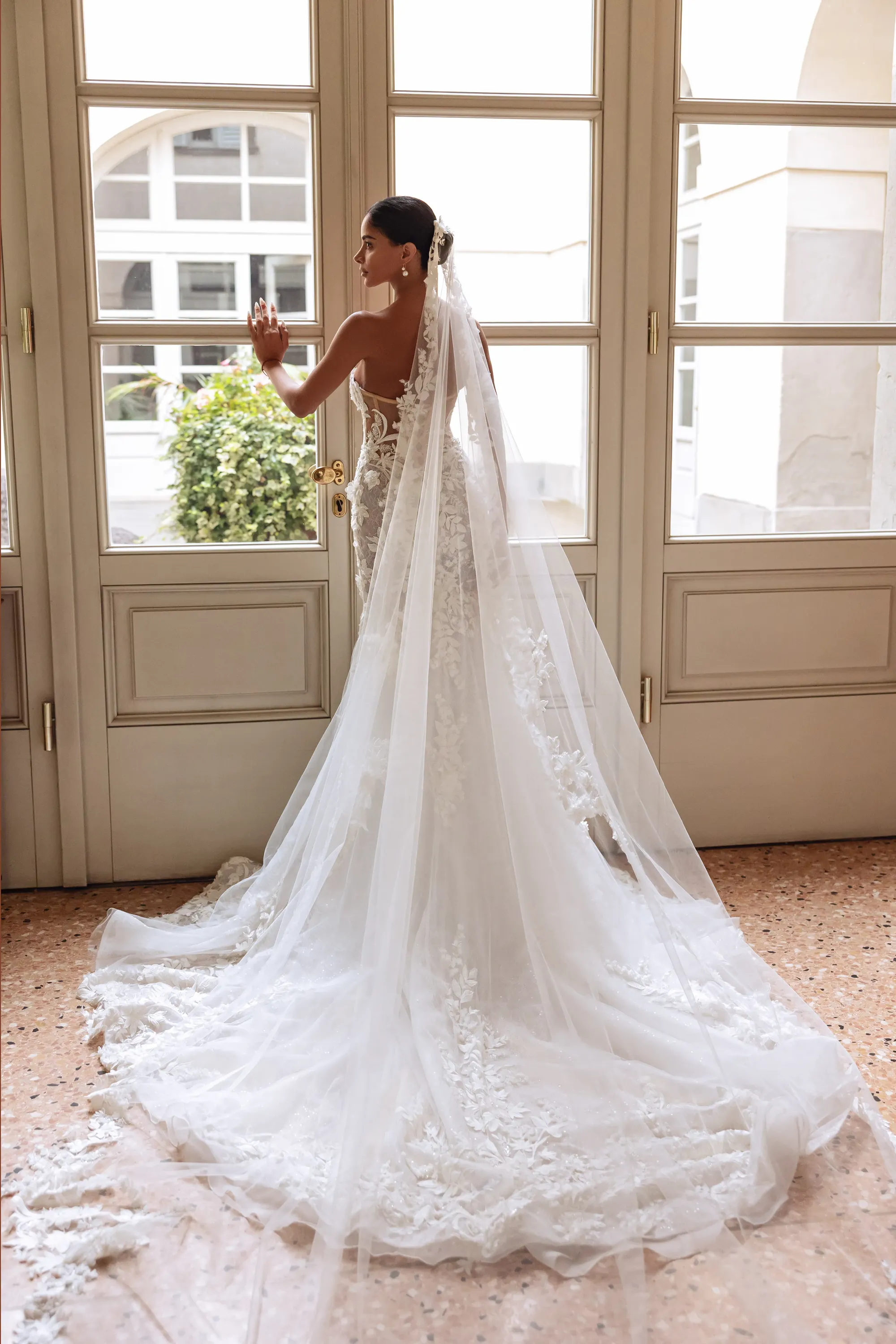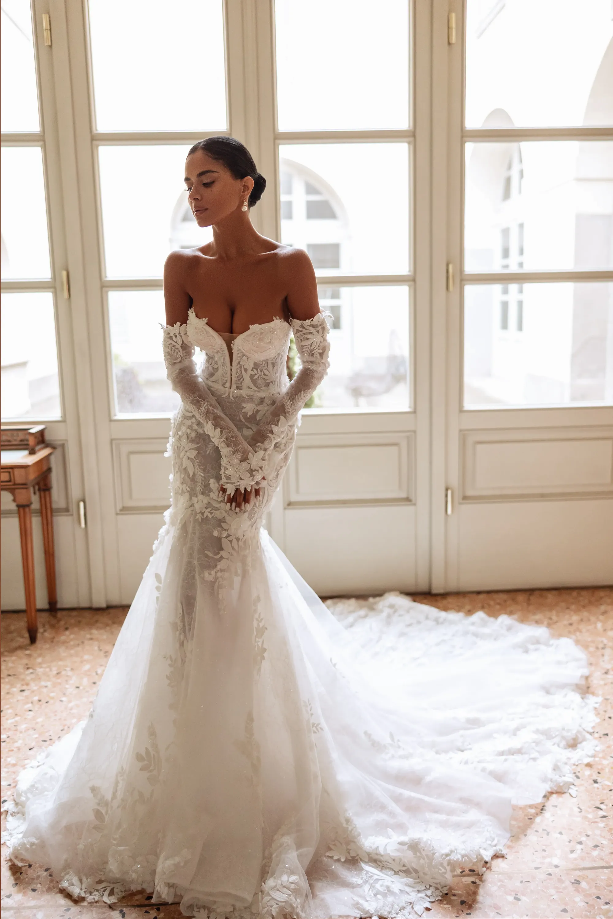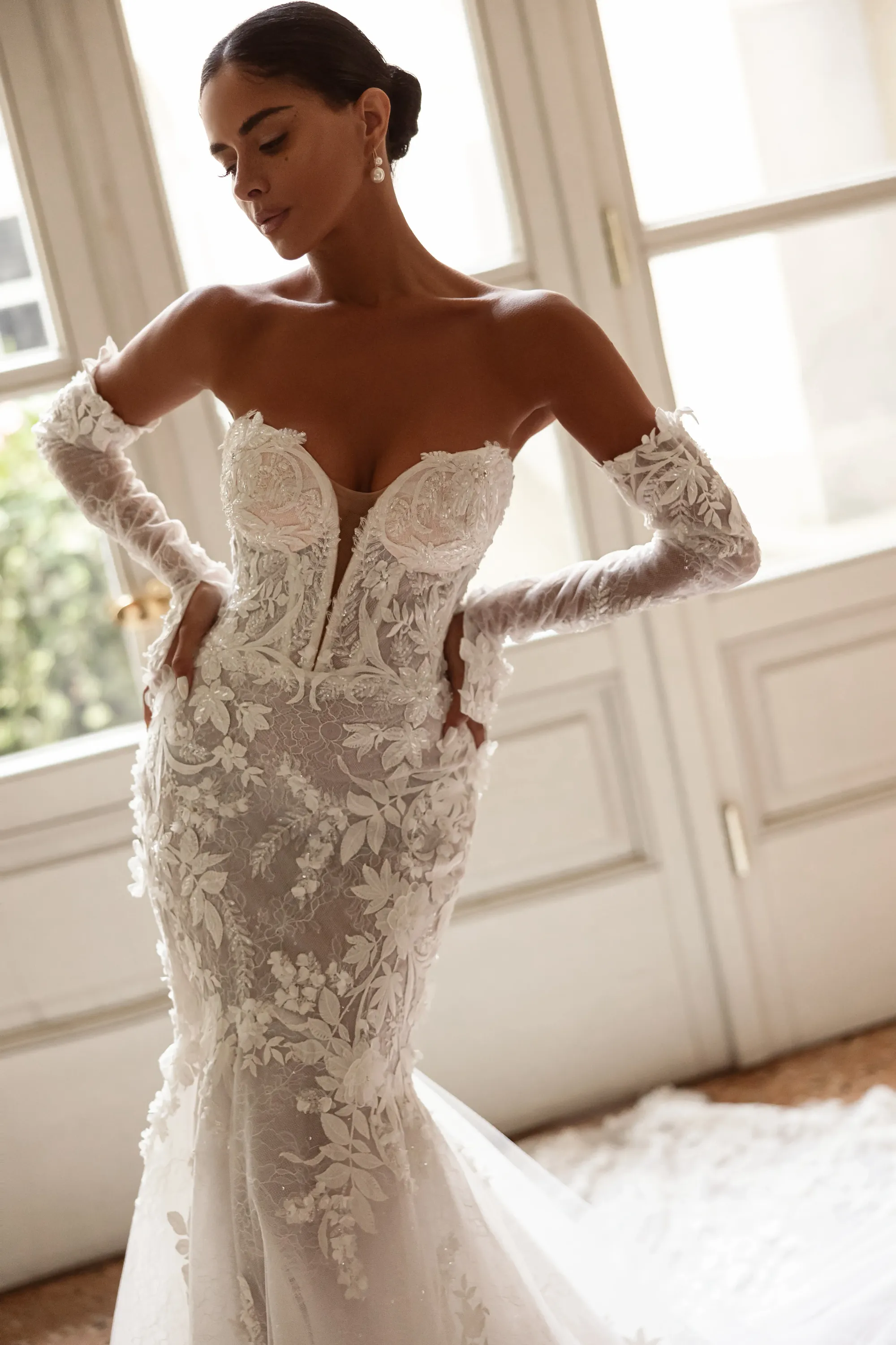 This captivating mermaid gown in soft milk color is crafted from shimmering mesh and beautifully embroidered lace adorned with beads and sequins. The dress is elegantly complemented by detachable long sleeves, adding a touch of elegance and sophistication. A long veil with intricate lace detailing completes the gown, making it a perfect choice for the bride who desires both glamour and refinement.