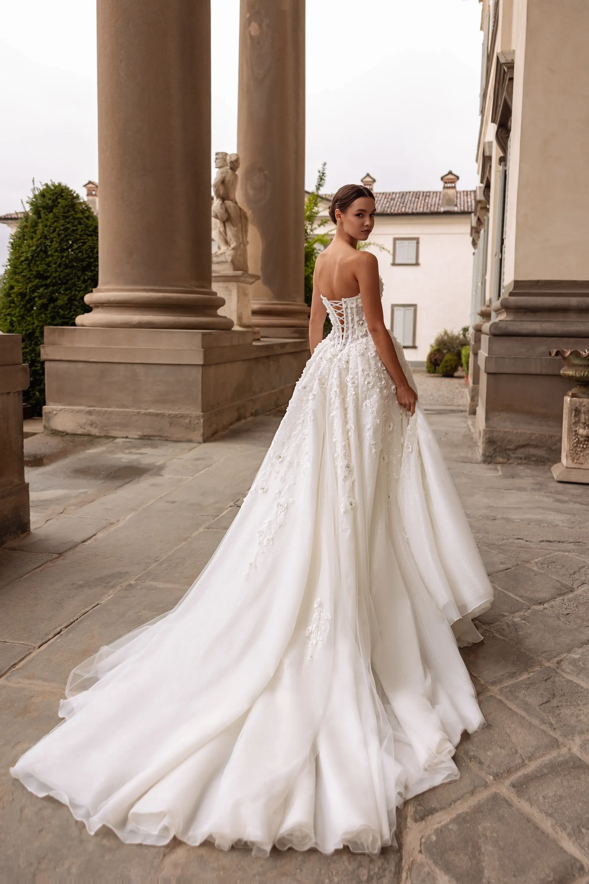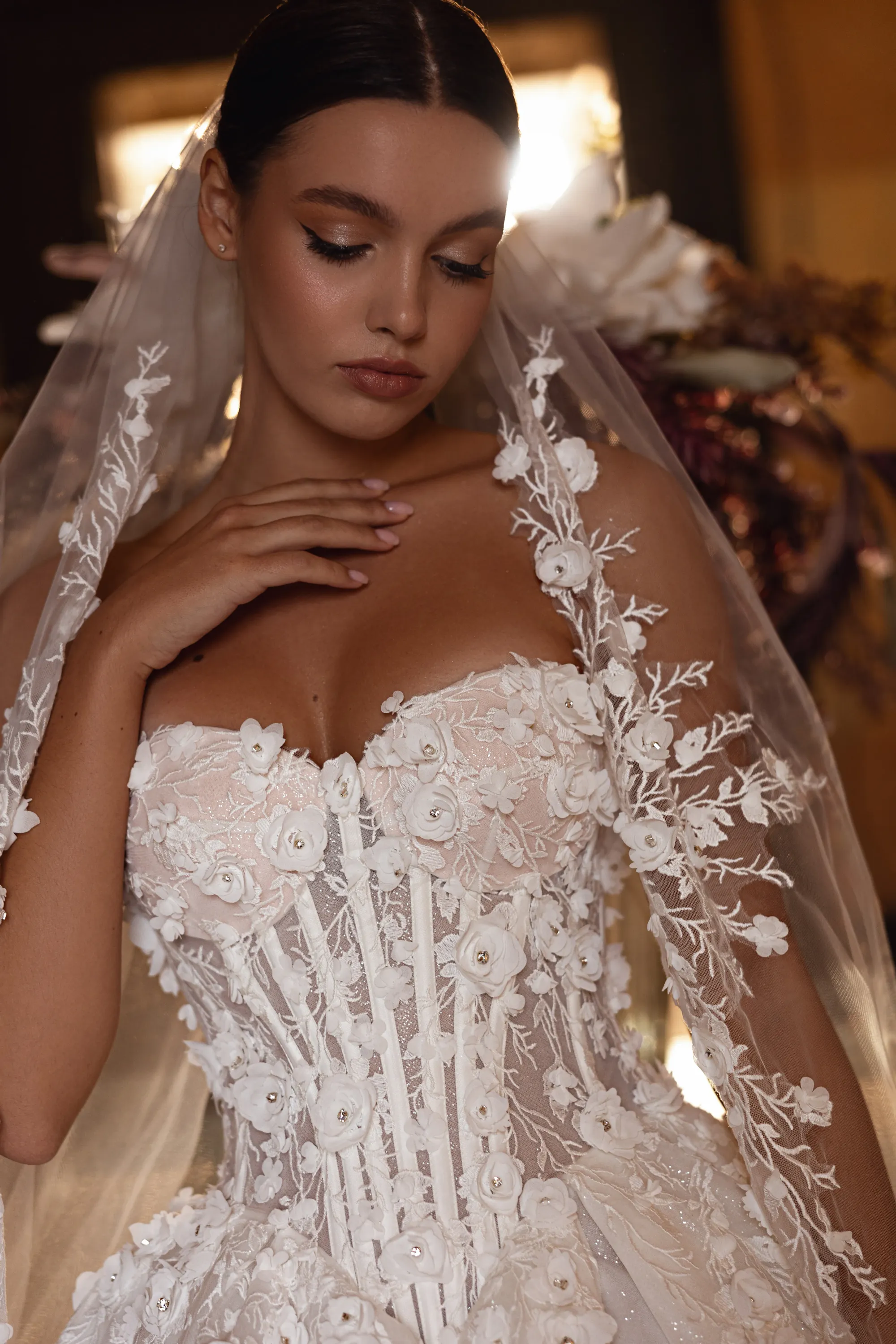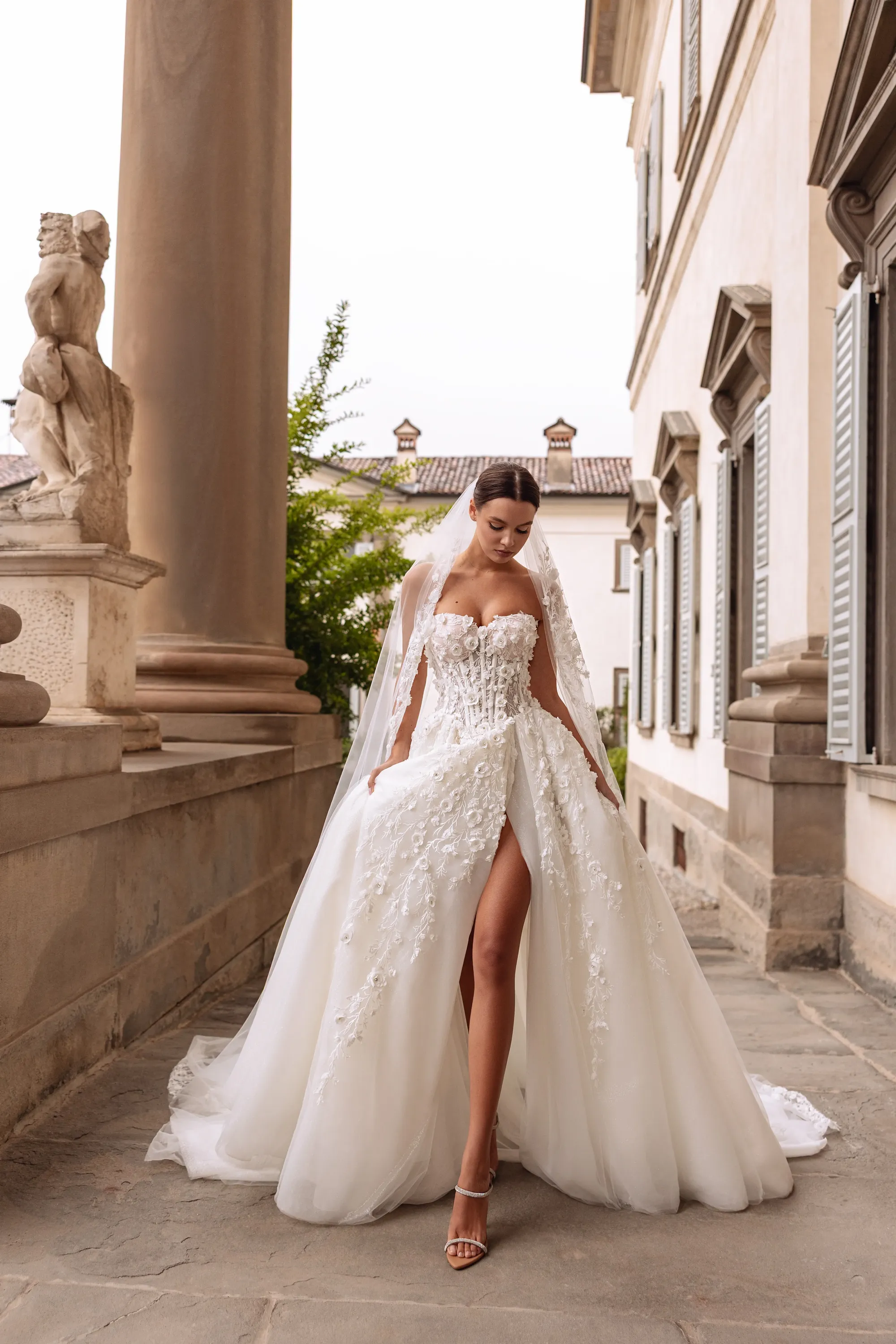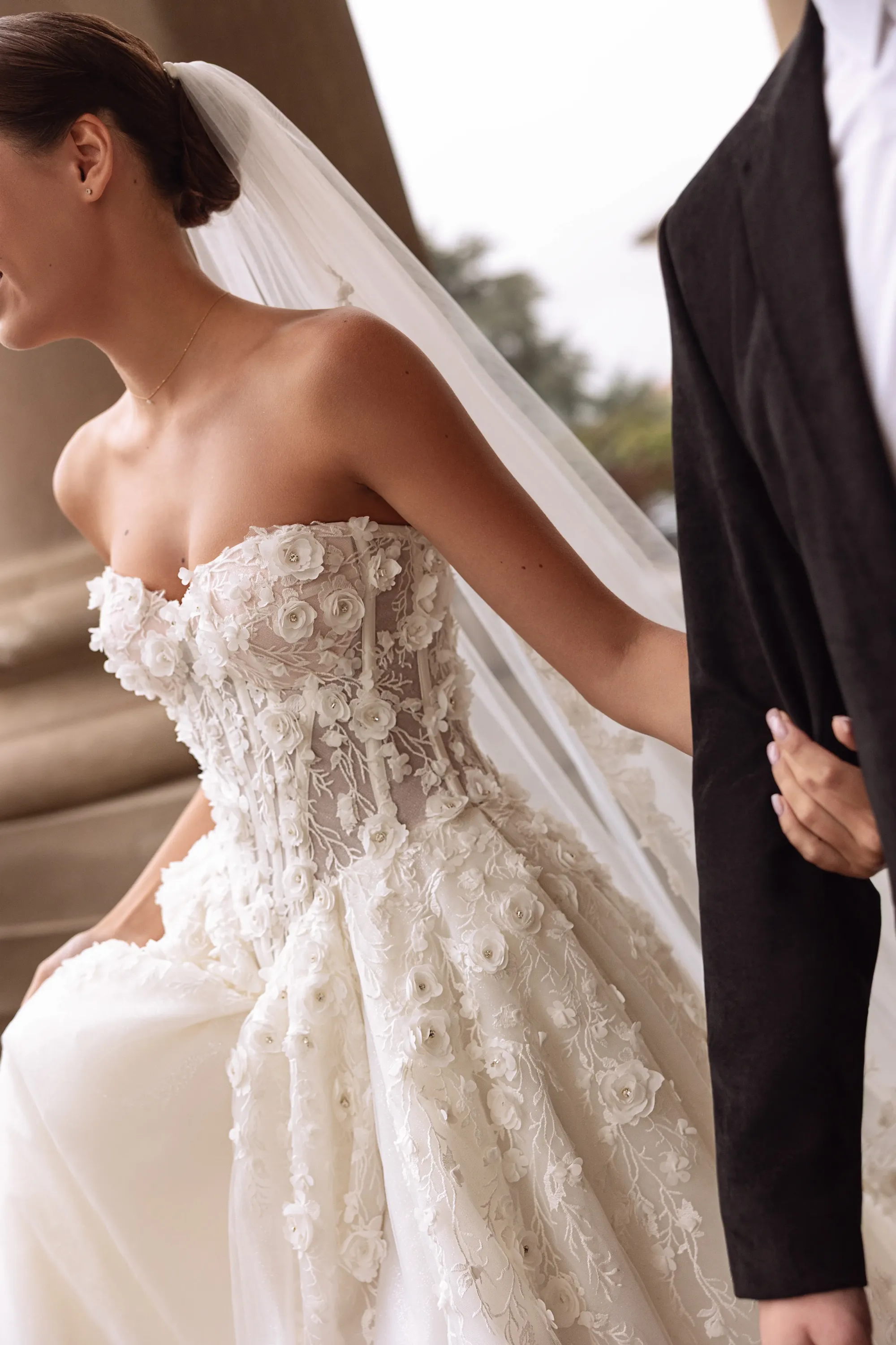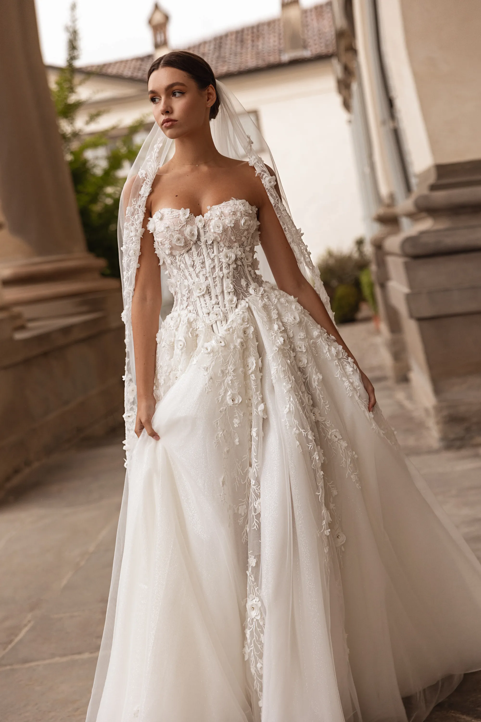 This enchanting princess silhouette gown in soft milk color is crafted from delicate mesh. The corset is adorned with external decorative boning that accentuates the silhouette, while 3D chiffon roses embellish the bodice and extend their intricate pattern onto the front of the skirt. A daring thigh-high slit adds a touch of sensuality and sophistication to the design. Perfect for the bride who desires both romantic elegance and modern allure.