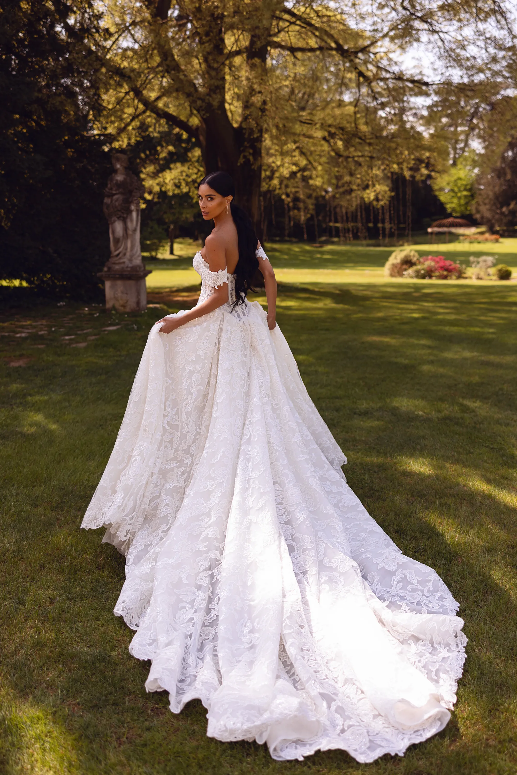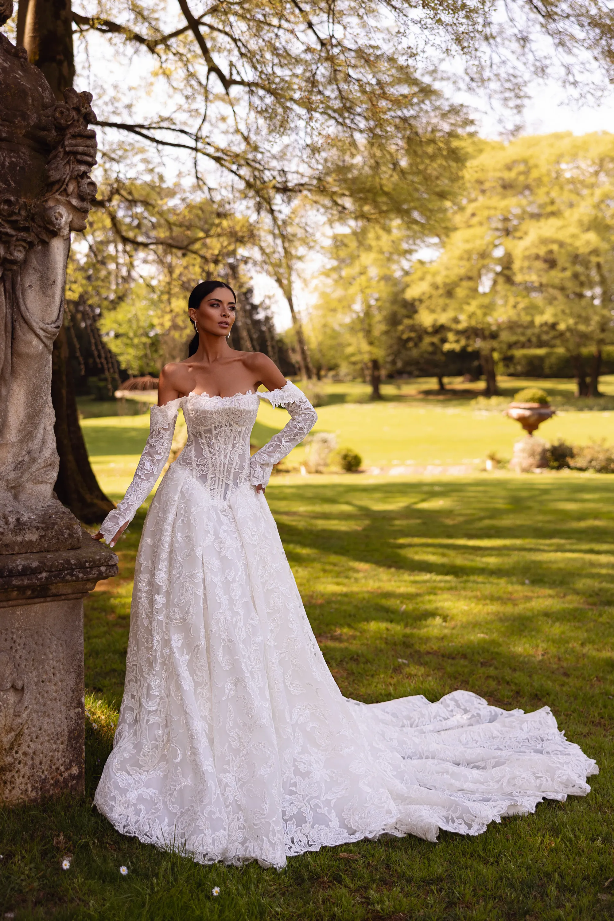 This romantic A-line gown in soft ivory is crafted from delicate corded lace embellished with subtle sequins that add a gentle sparkle. The semi-sheer corset features a flattering V-shaped neckline and off-the-shoulder design that highlights the décolletage. Removable long sleeves offer styling versatility, while the lace-up back ensures a perfect fit. Finished with a flowing train, this dress is the epitome of timeless elegance.