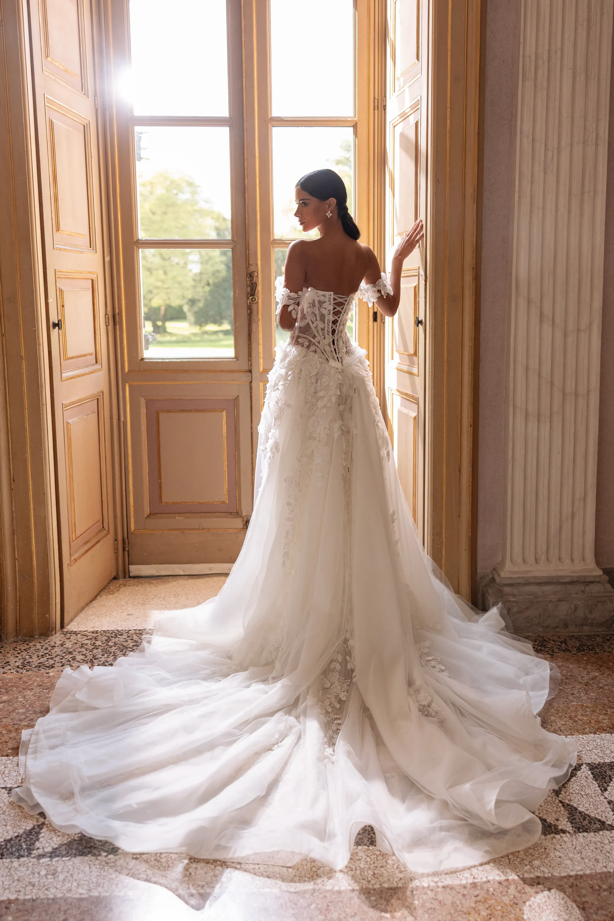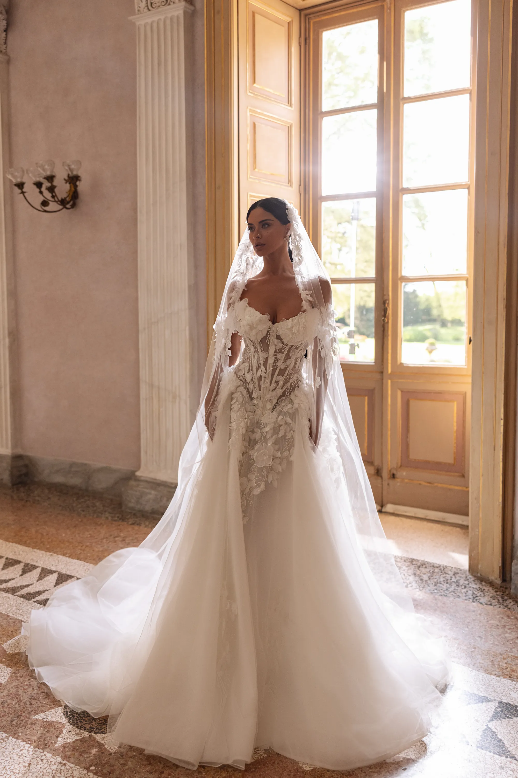This ethereal A-line gown is crafted from soft ivory tulle, featuring a semi-sheer corset with off-the-shoulder straps and a flattering V-shaped waistline. Sculpted boning creates a slimming effect as it tapers toward the waist. The corset is adorned with delicate 3D floral lace that gently cascades onto the skirt, adding depth and romance. A lace-up back and luxurious train complete the look, beautifully paired with a royal veil embellished with matching 3D lace elements.