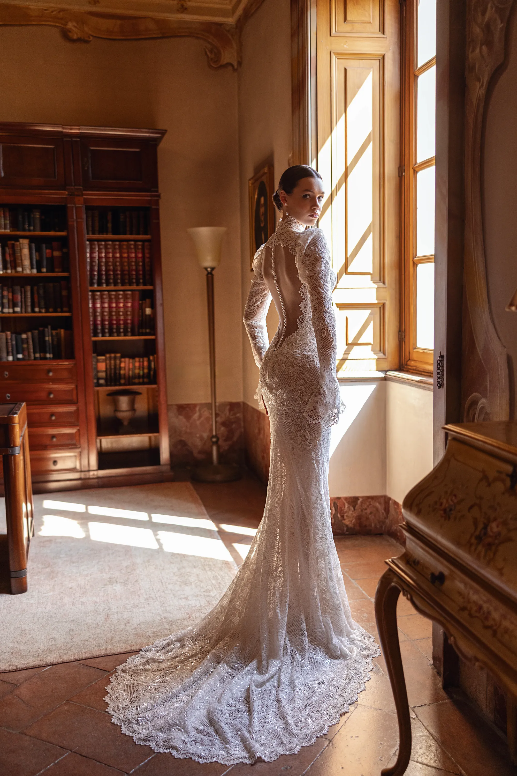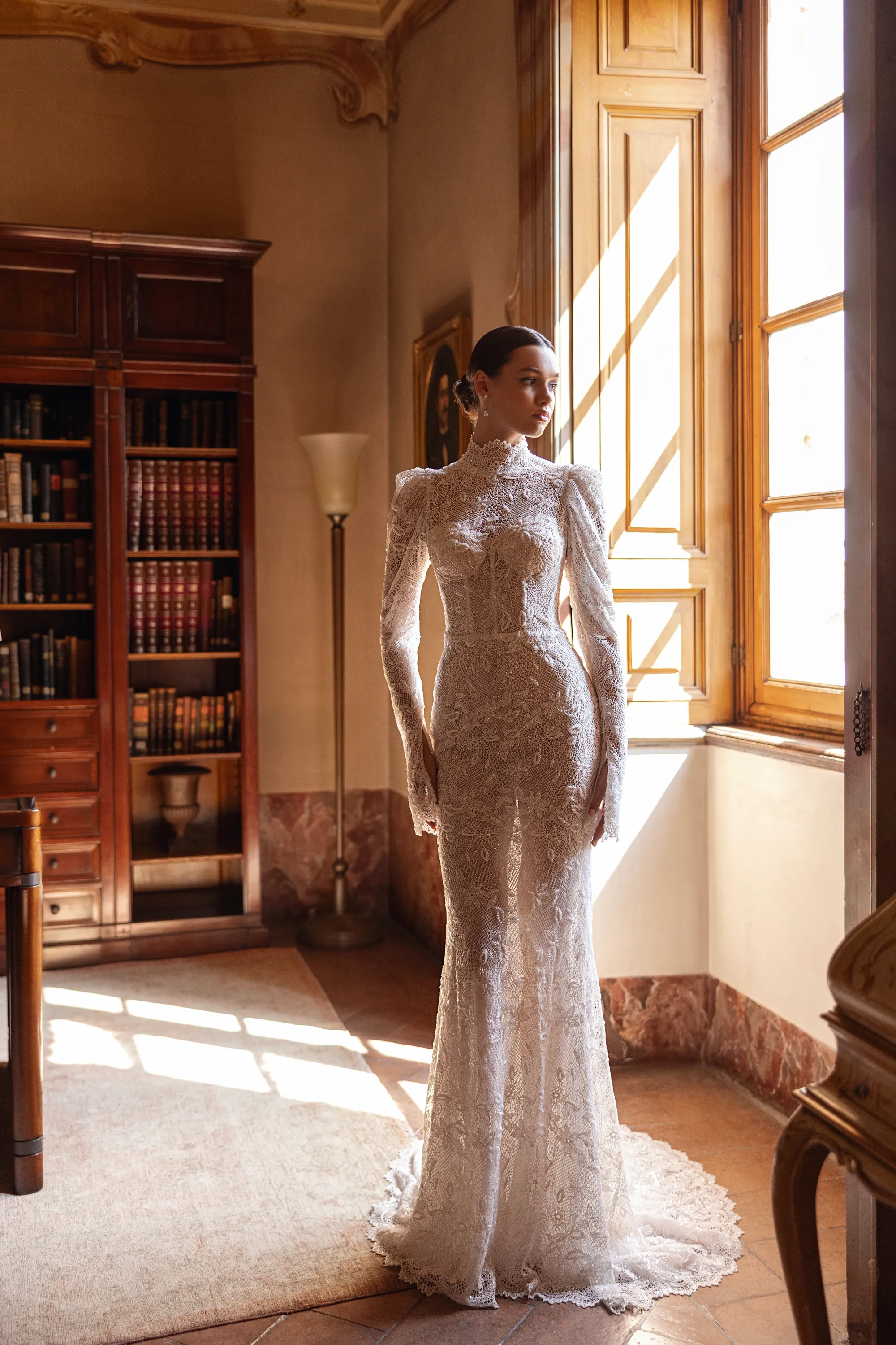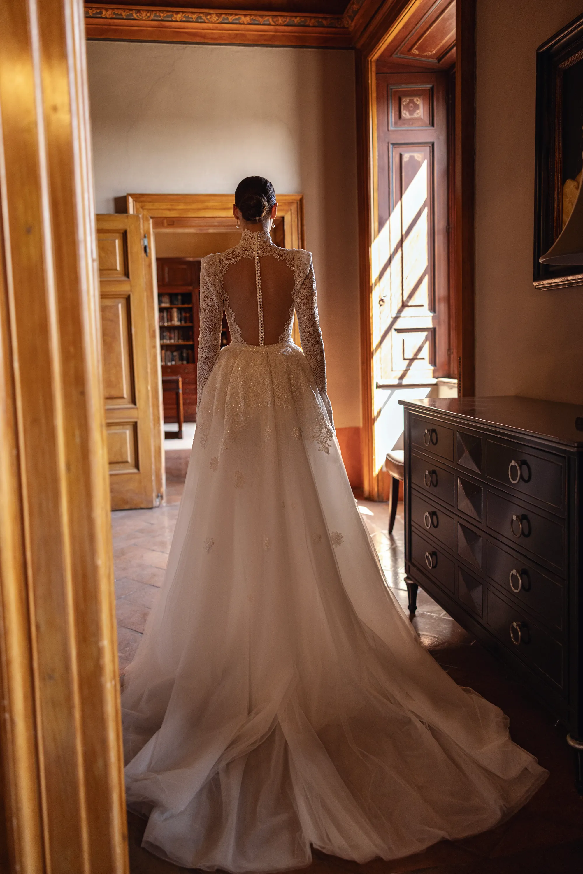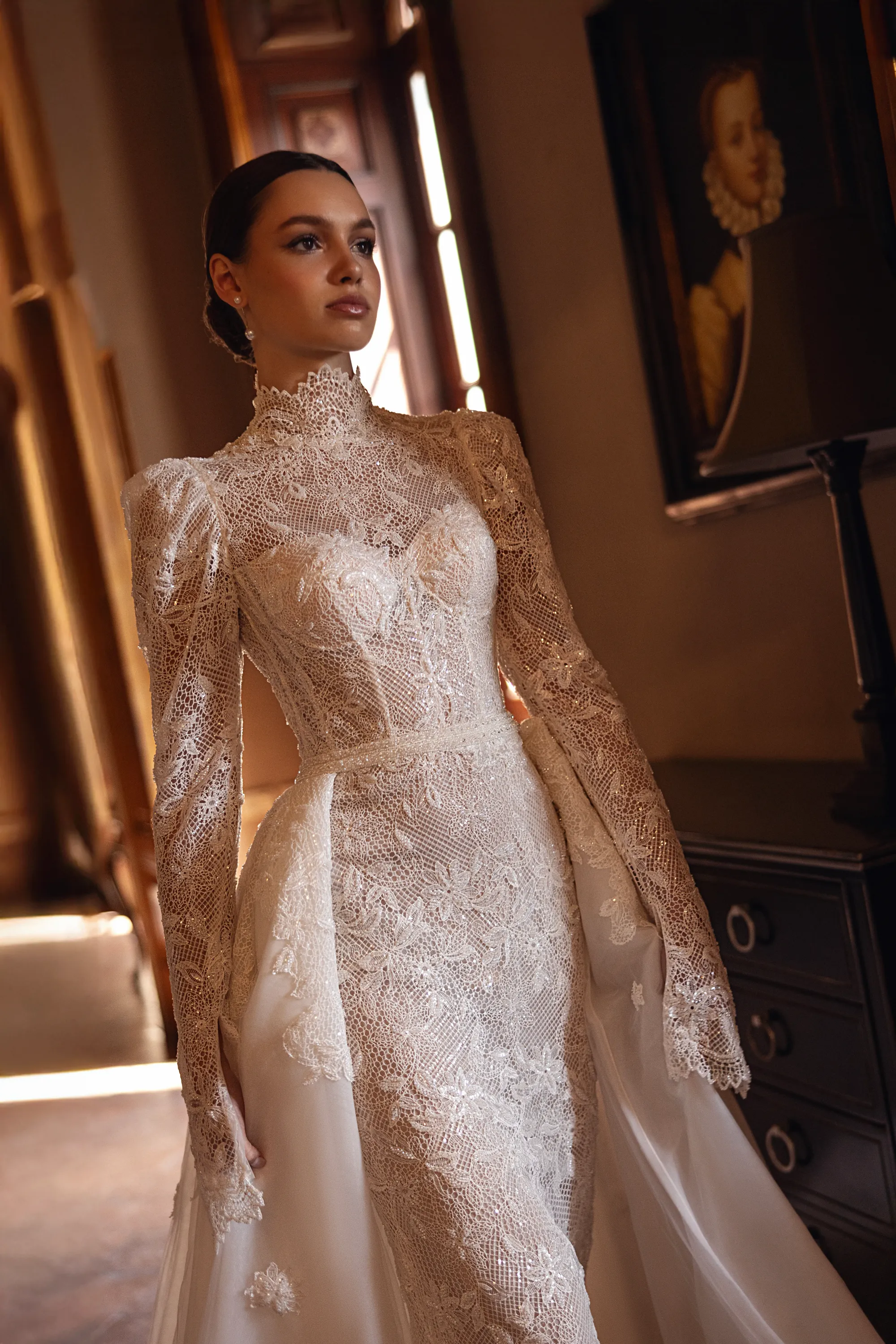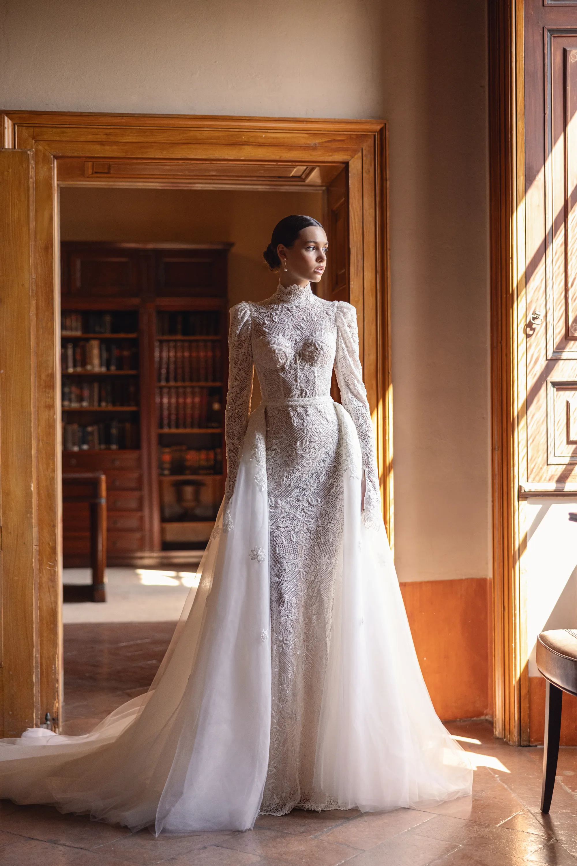 This sophisticated semi-sheer mermaid gown features a high neckline and long sleeves, crafted from intricately beaded macramé lace. The back stuns with a deep open cut framed by a row of delicate buttons over nude mesh, adding a touch of refined allure. The gown is paired with a removable voluminous tulle overskirt adorned with matching lace appliqués and a sweeping train, offering a dramatic, two-in-one bridal look full of texture and elegance.