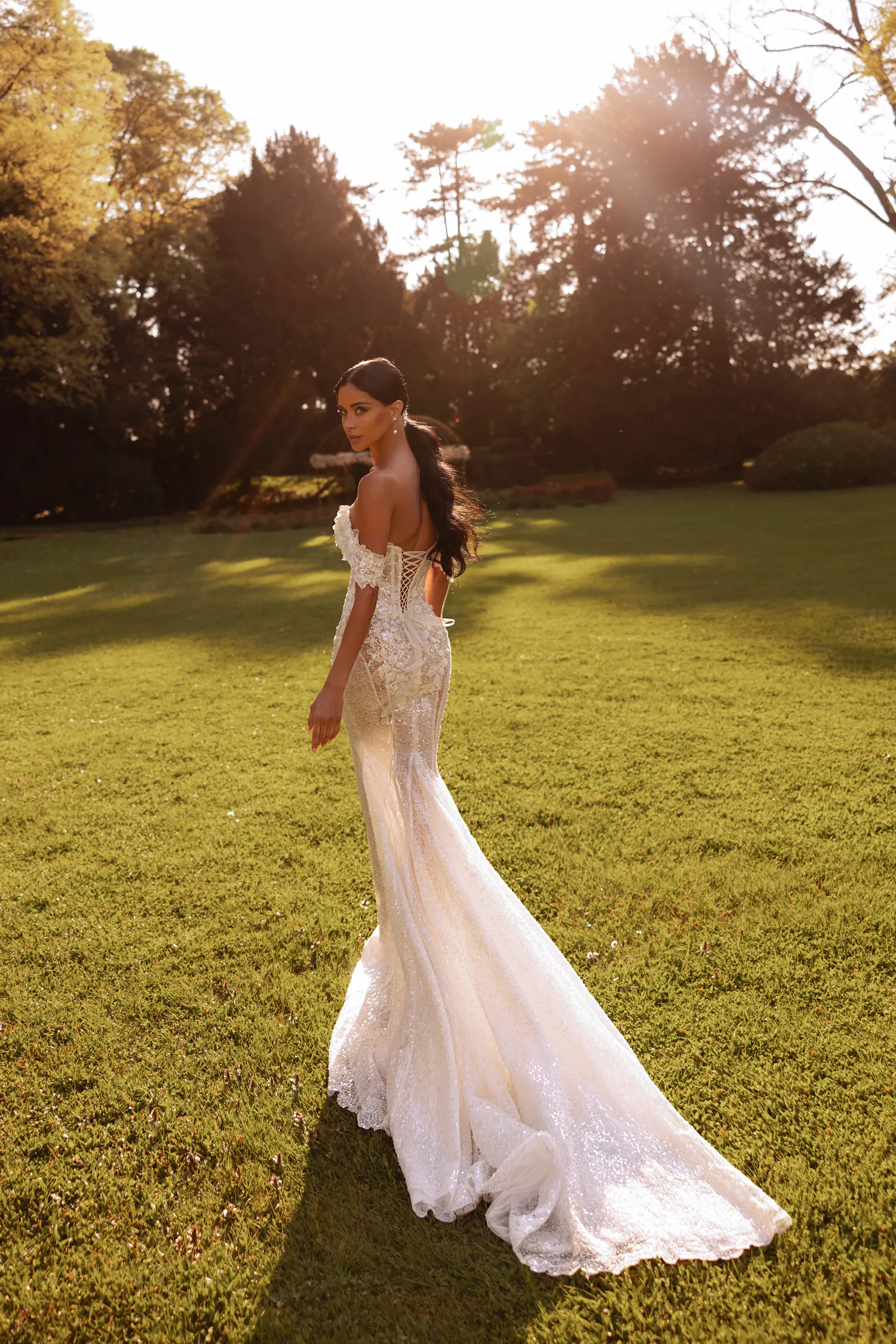 This romantic off-the-shoulder mermaid gown is made from delicate Chantilly lace with subtle sequin detailing that catches the light beautifully. The structured bodice features a flattering V-shaped waistline and is adorned with elegant floral lace appliqués. Sheer tulle inserts along the sides of the hips create a modern, sculpting effect. A long veil with a lace-trimmed edge completes the look, adding a touch of timeless grace.