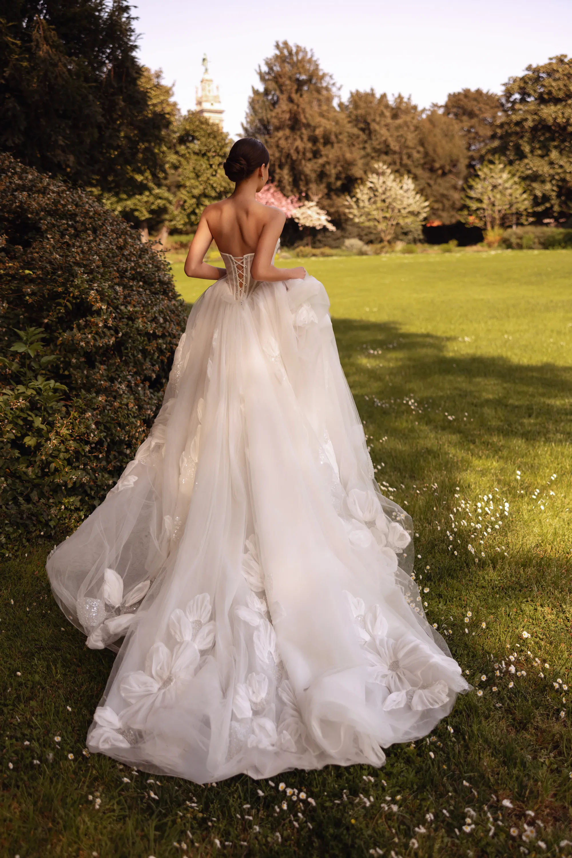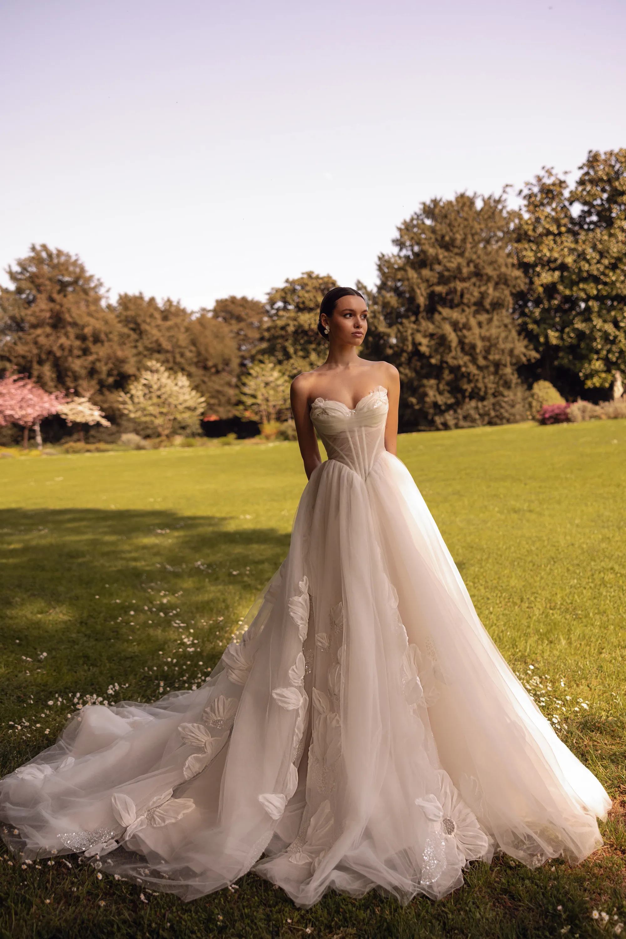 This dreaming A-line gown is crafted from soft layers of tulle and adorned with delicate chiffon floral appliqués accented by subtle sequins. The semi-sheer corset features a flattering V-shaped waistline and a gathered tulle bust, from which floral elements gracefully peek through, adding a touch of magic and romance. Matching floral appliqués cascade down the flowing train, creating a cohesive, fairytale-inspired look.