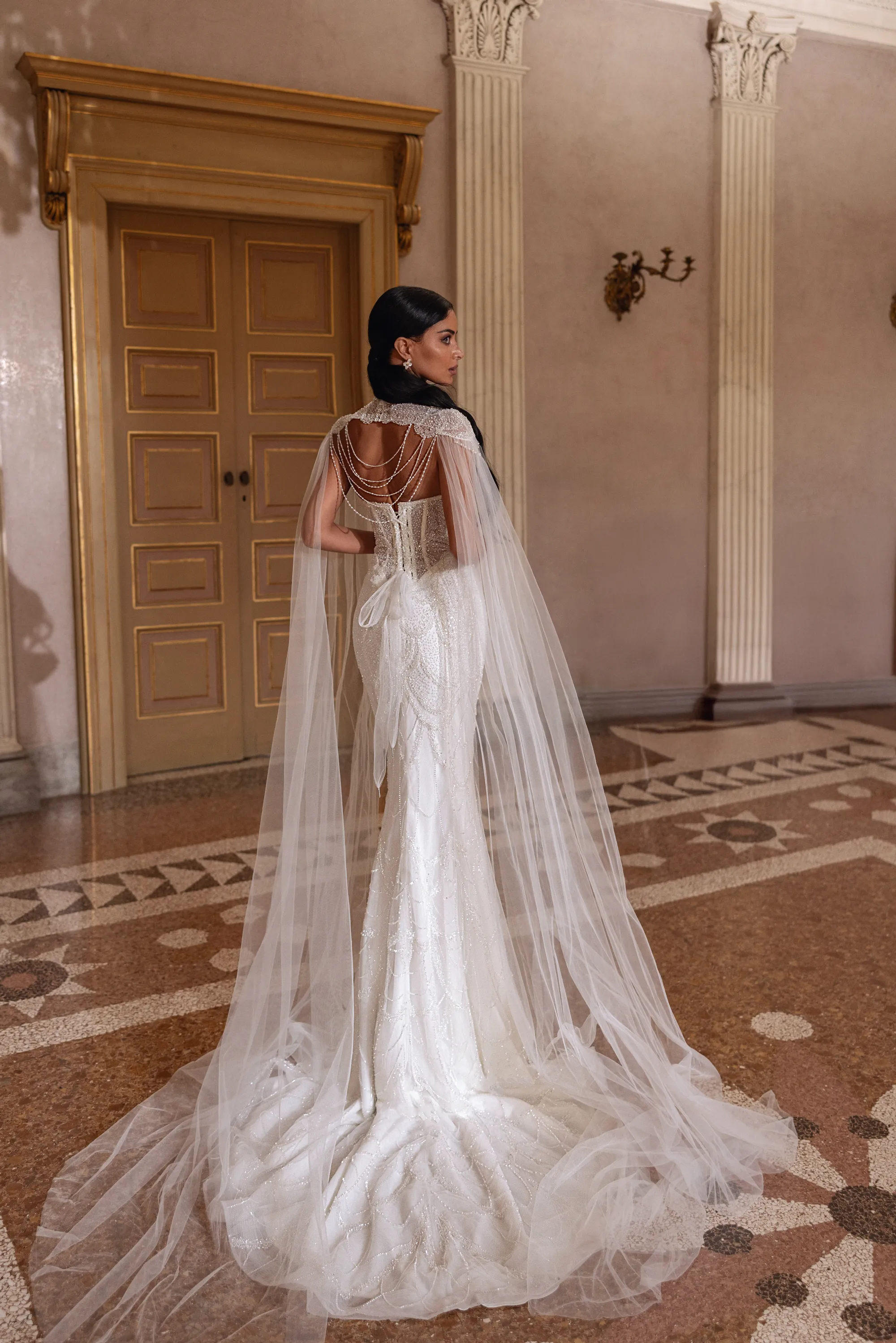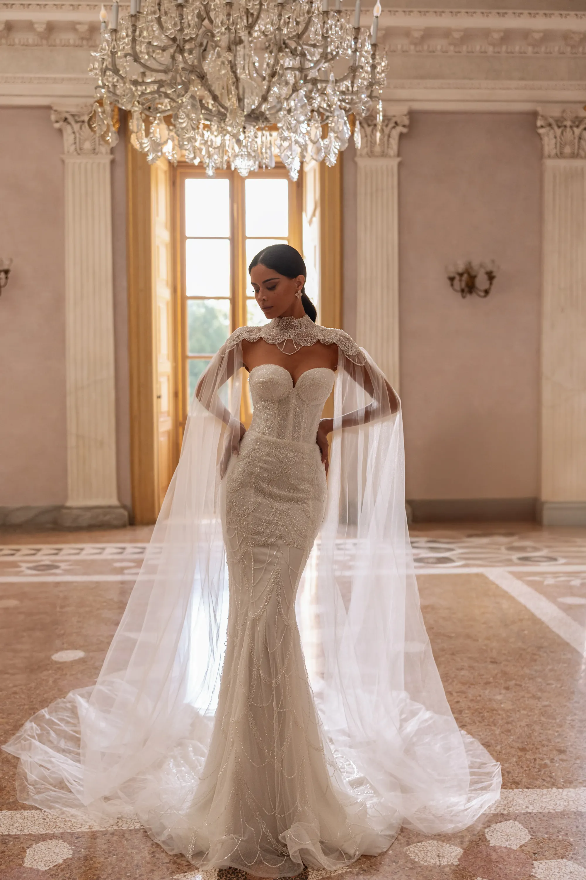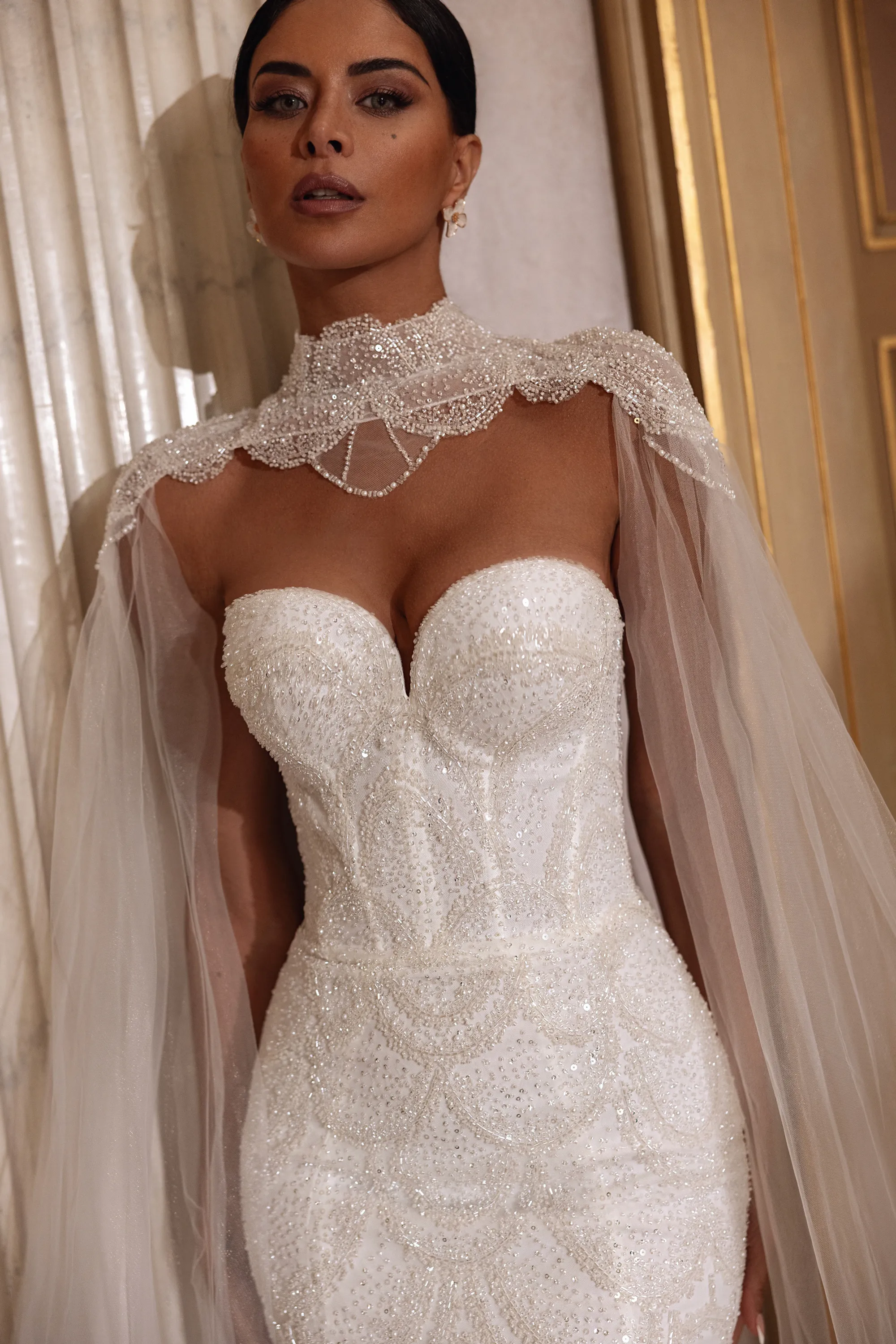 A breathtaking mermaid gown crafted from beaded lace, featuring a heart-shaped neckline. Cascading layers of lace flow gracefully down to the hem, creating a dramatic and elegant silhouette. The look is completed with a detachable royal cape made from matching beaded lace, fastening at the neck. From the shoulders, ethereal tulle sleeves fall like wings, forming a soft train. Sparkling beaded embellishments on the back of the cape add a final touch of enchantment and glamour.
